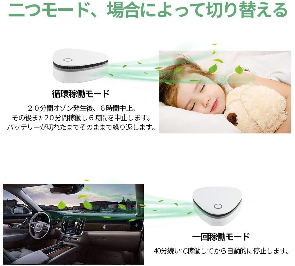 【2モード設定?静音設計】A.循環稼働モード:電源ボタンを長押しで循環稼働モードに入ります(パイロットランプ は点滅する)。本機が20分間運転してから6時間ほど一時停止する作業を循環とされます。B.定時モード:循環稼働モードで一回電源ボダンを押して、定時モードに切り替えます(パイロットランプ は点灯する)。40分間運転した後に自動停止します。充電式で満電状態だと、循環モード約2日間、定時モード約7回使用できます。お使い場合次第に、モードを選定してください。稼働中には気付いてないほど静かですので、夜でも安心に使えます。(オゾン放出量は20mg/h(1m3)で、ご安全を守るため、オゾン脱臭中および脱臭後30分以内は人や動物が密閉性の高いを離れる必要があります。)