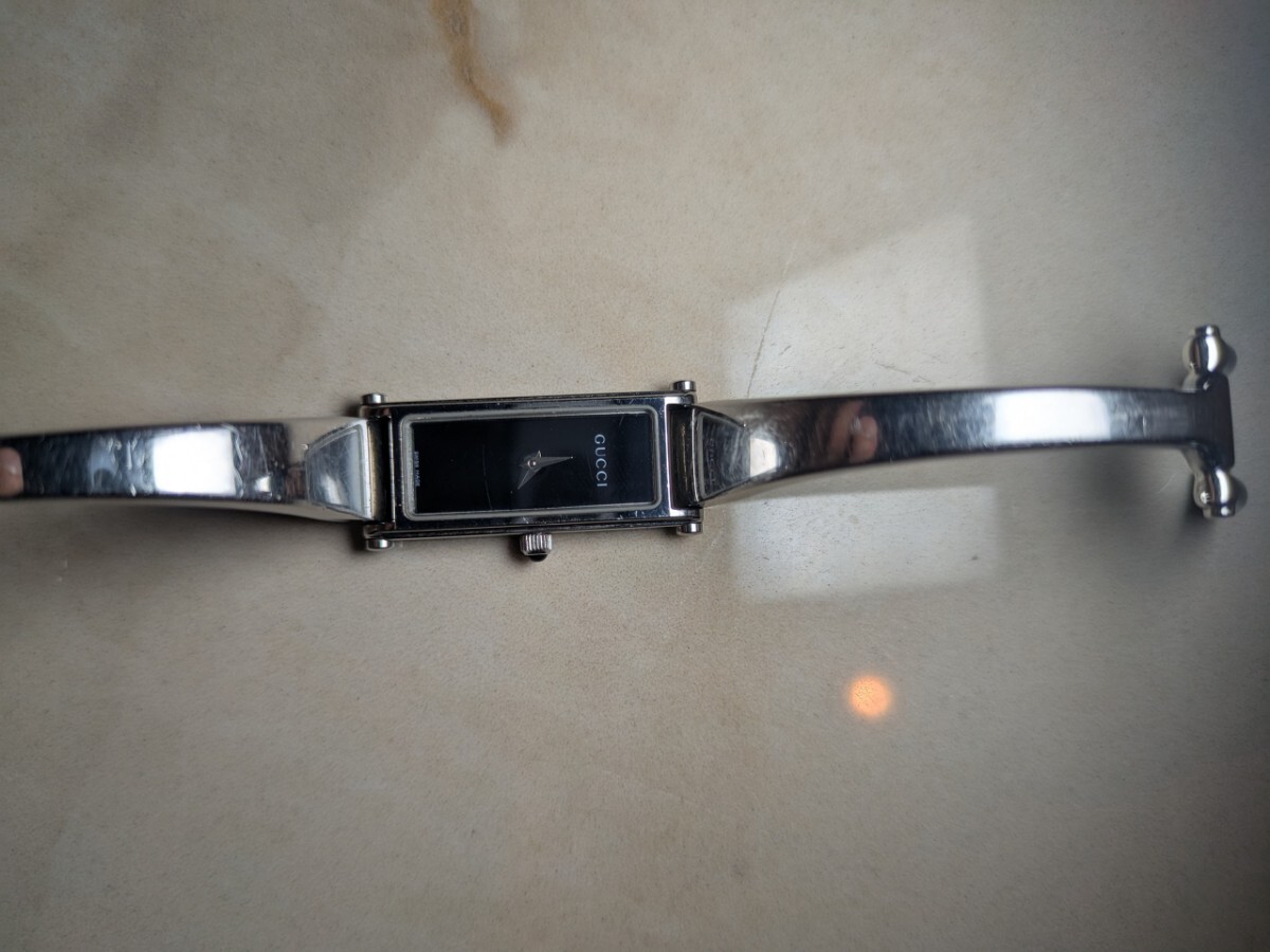 GUCCIの1500Lバングルウォッチです。シンプルなデザインで、アクセサリー感覚で身につけられます。
