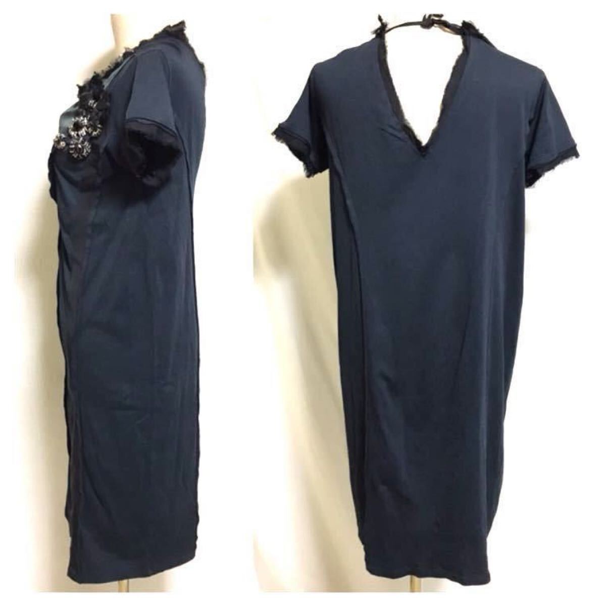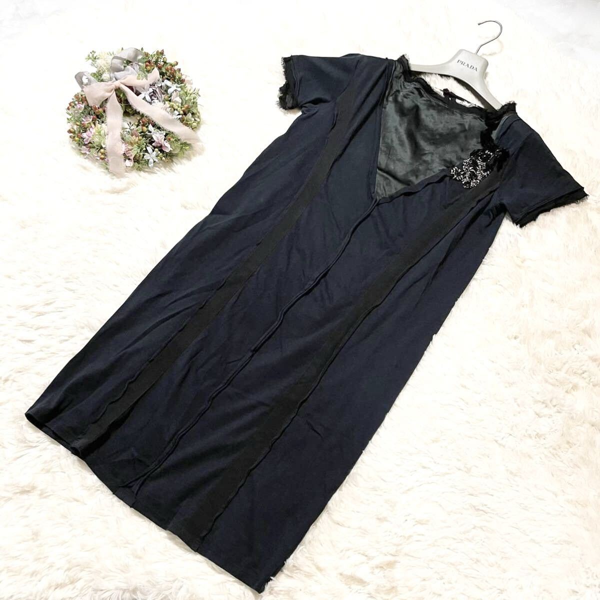 | 本物 プラダ フラワービジュー装飾付き シルク レース切替 ワンピース ドレス S 黒 紺 PRADA | |||||