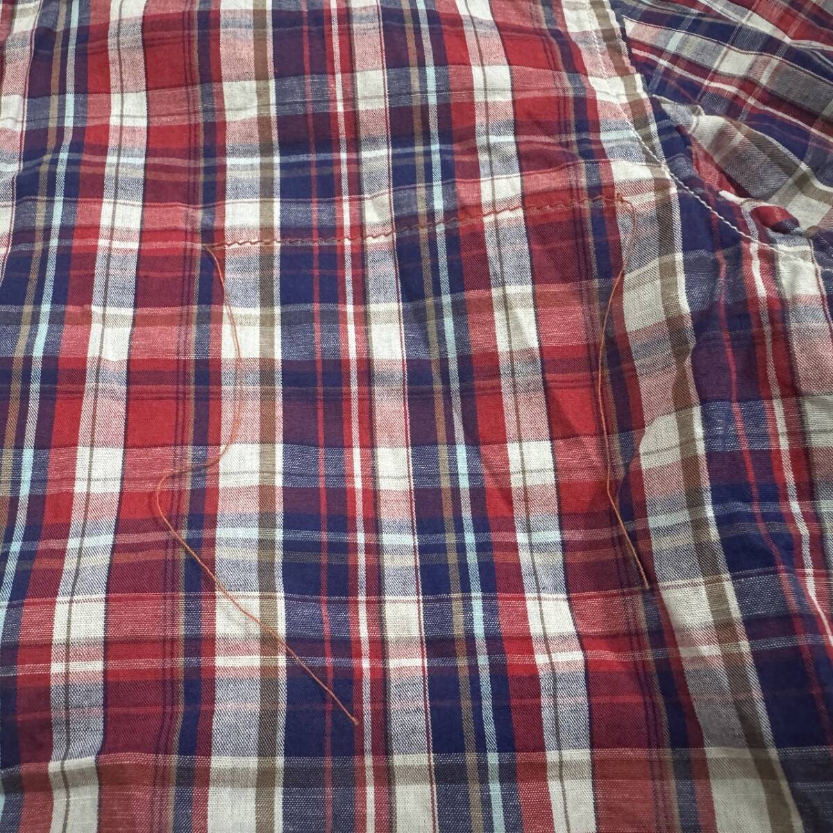 胸ポケットはないのですが、本来胸ポケットがある位置にオレンジ糸でステッチだけが入っています。
