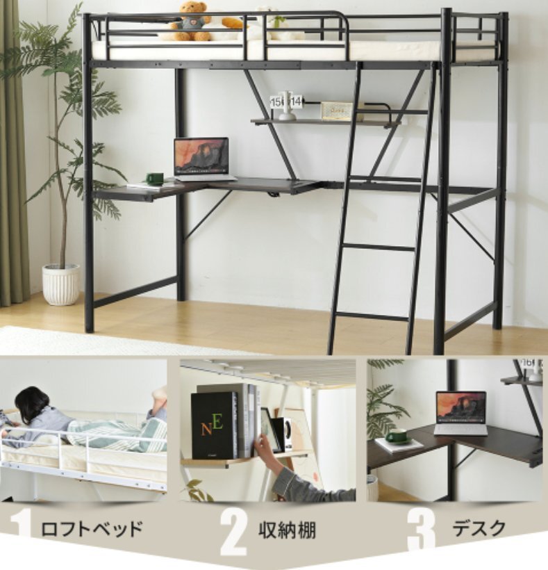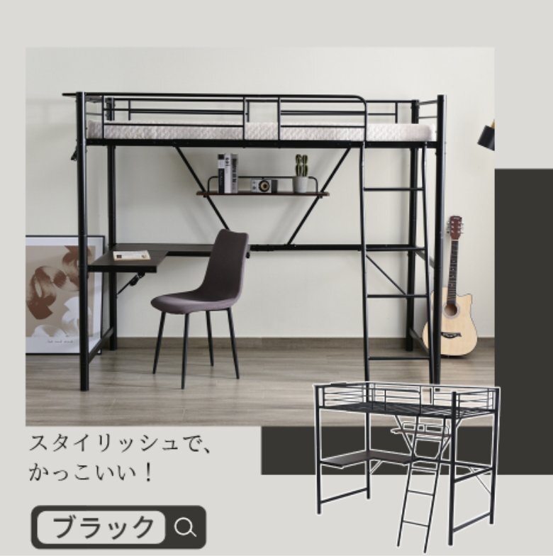 【ブラック】システムベット 宮棚 ロフトベッド シングル コンセント付き デスク付き 収納付き ラック棚付き 北欧風 二段ベッド 大人用