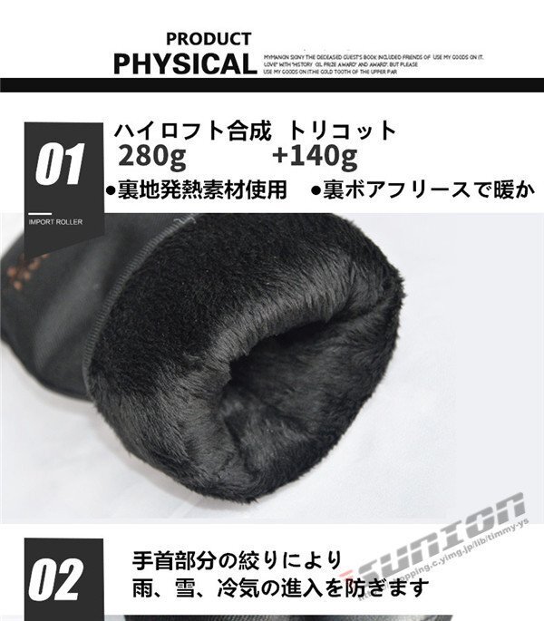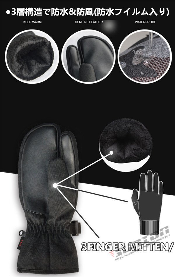 【商品特徴】【素 材】 甲 部 分:ポリエステル100%(ポリウレタンコーティング加工)  その他部分:合成皮革(ポリウレタン樹脂コーティング)【機能性】●3層構造で防水&防風(防水フイルム入り)濡れにくく快適にご使用いただけます ●人体工学に基づいた自然な指のカーブに合わせた設計●裏地発熱素材使用●裏ボアフリースで暖か●指先と手の平に滑り止め付き【適  応】:スキー スノーボード スノーウェア スノボウェア 防寒 冬 雪かき 除雪 スノーグローブ