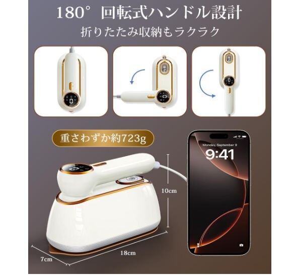 • 【折りたたみ&持ち運び便利|軽量&コンパクト】 スチーム アイロン にはハンドル部分は180°回転でコンパクトに折りたたみ可能。軽量設計なので、旅行や出張、衣装の持ち出しにもラクラク対応。スーツケースやキャリーバッグにも簡単に収まり、省スペースで収納できます。家でも外出先でも、衣類スチーマーとしていつでもサッと使えるのが魅力です。