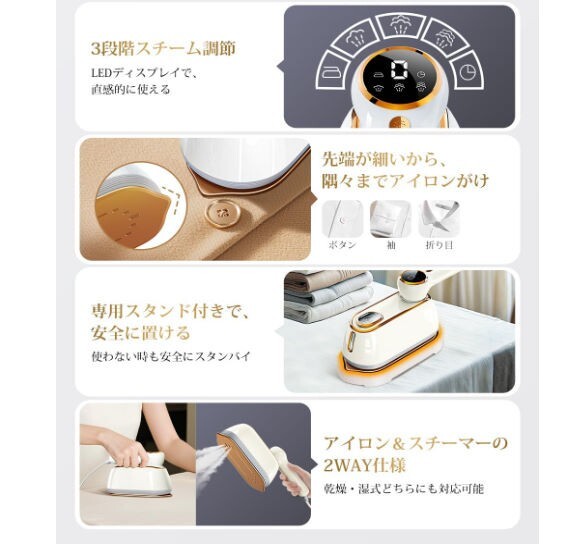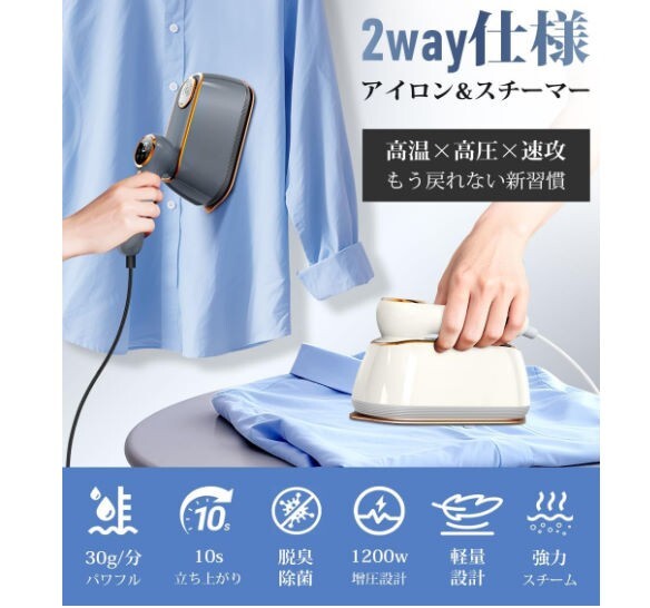 • 【1台2役|スチーム×アイロン両対応】この ハンディスチーム アイロン は、 衣類スチーマー としてシワを伸ばすだけでなく、通常のアイロンとしてもしっかり使用可能な2WAY仕様。ハンガーにかけたままでも、 アイロン 台 で丁寧にプレスすることもできるため、毎日の衣類ケアが簡単・時短に。 服 ワイシャツ・ジャケット・ワンピースだけでなく、ワッペンやゼッケンなどの貼り付け作業にも便利な スチームアイロン です。