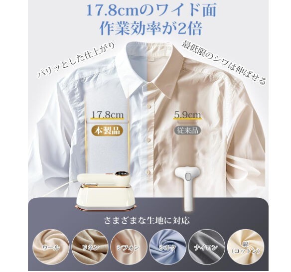 • 【付属品充実|断熱ベース&計量カップ付き】 断熱トレイは使用後の一時置きや保管に便利。専用の計量カップで給水も簡単・安心。スチーム時の水漏れややけど対策も万全で、安全に長くお使いいただけます。スチームアイロン には衣類・布マスクのケアや、手芸用途のアイロンワッペン貼り付けにも活用できる、機能性と汎用性を兼ね備えた衣類スチーマーです。