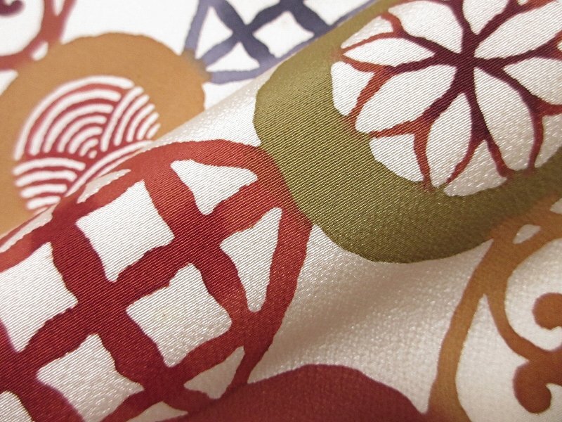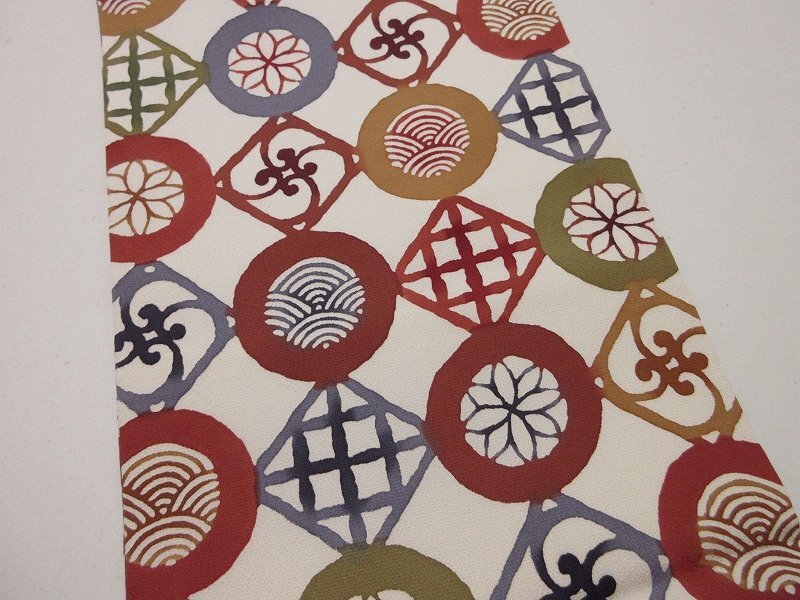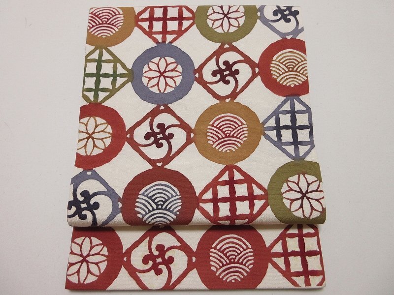 | 商品名 | ドークブア■九寸開き名古屋帯 型絵染 丸文 青海波に花 未使用 極上の逸品 C09 |