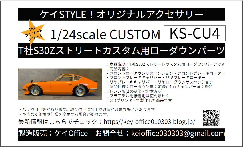 この度、ケイ STYLE!ブランドから、T 社製プラモデルの S30Z ストリートカスタム用ローダウンパーツを発売いたします。