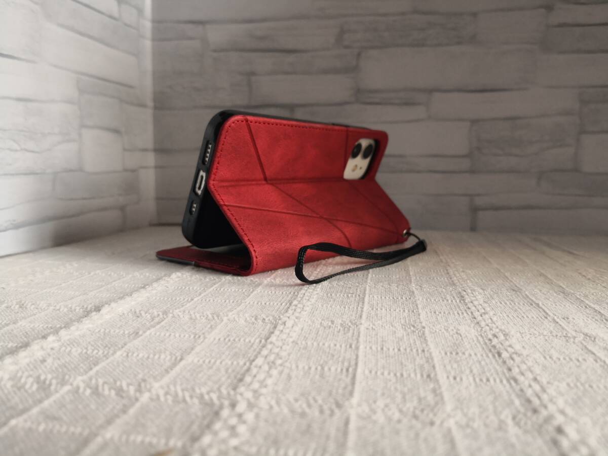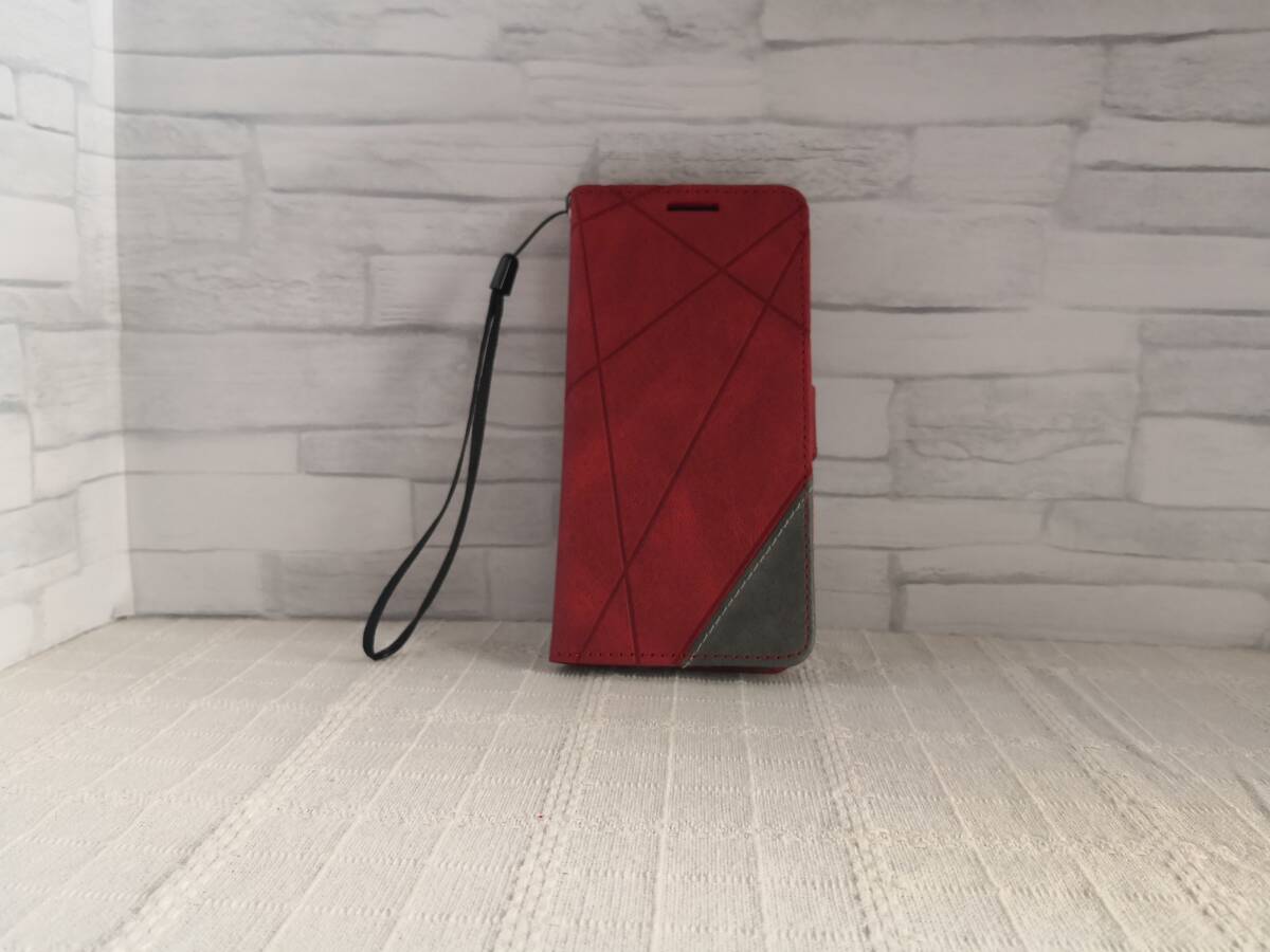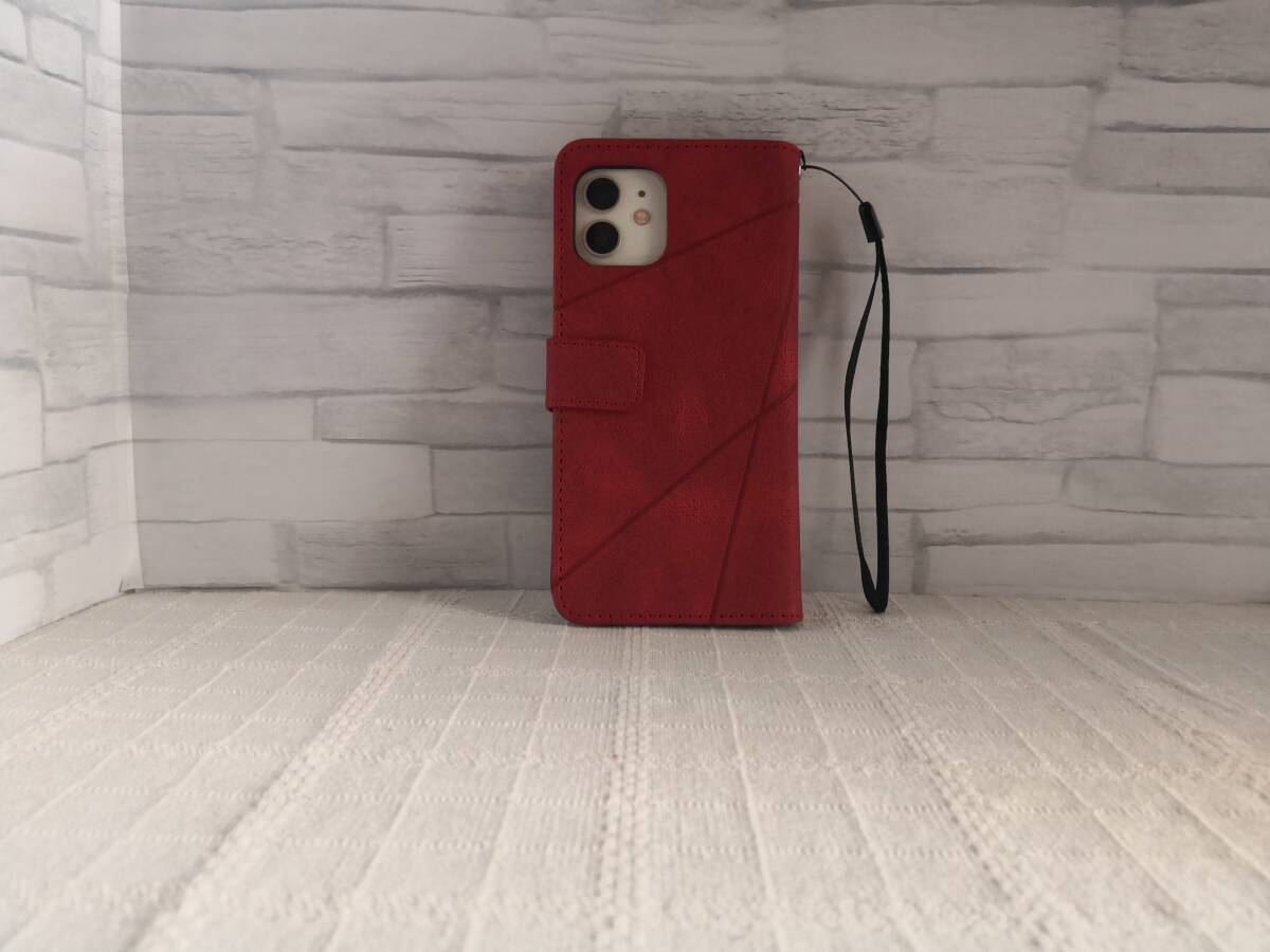 iPhone 12/12Pro 共用 ワインレッド 手帳型 レザー ケース カード,写真入&内ポケット ストラップ付 (格子柄)