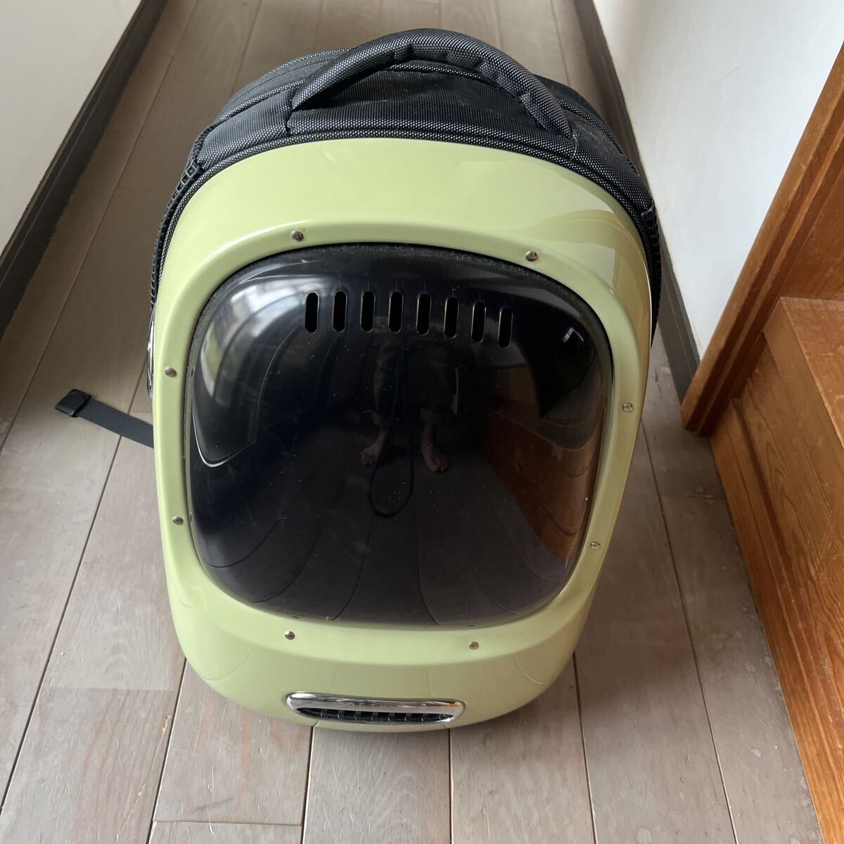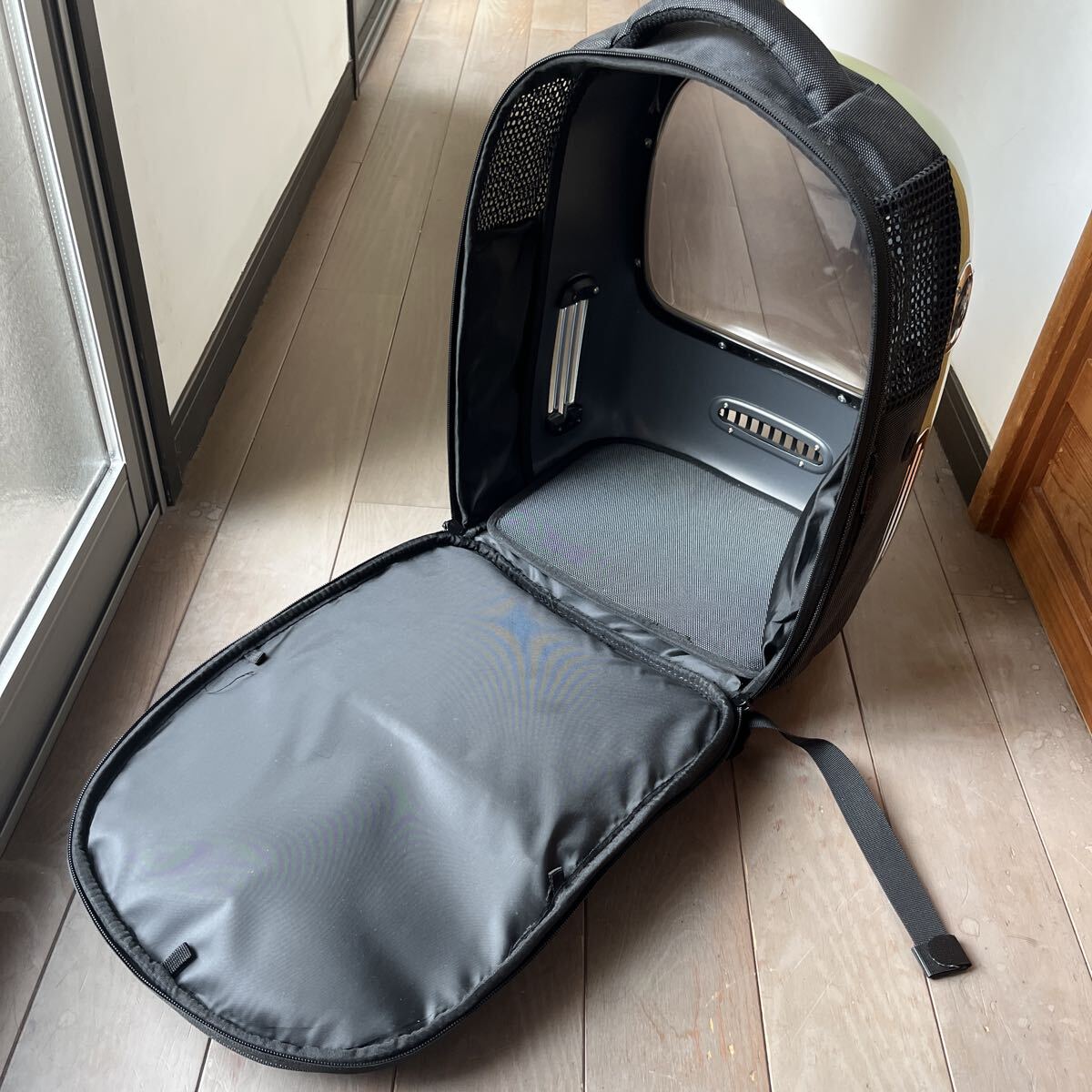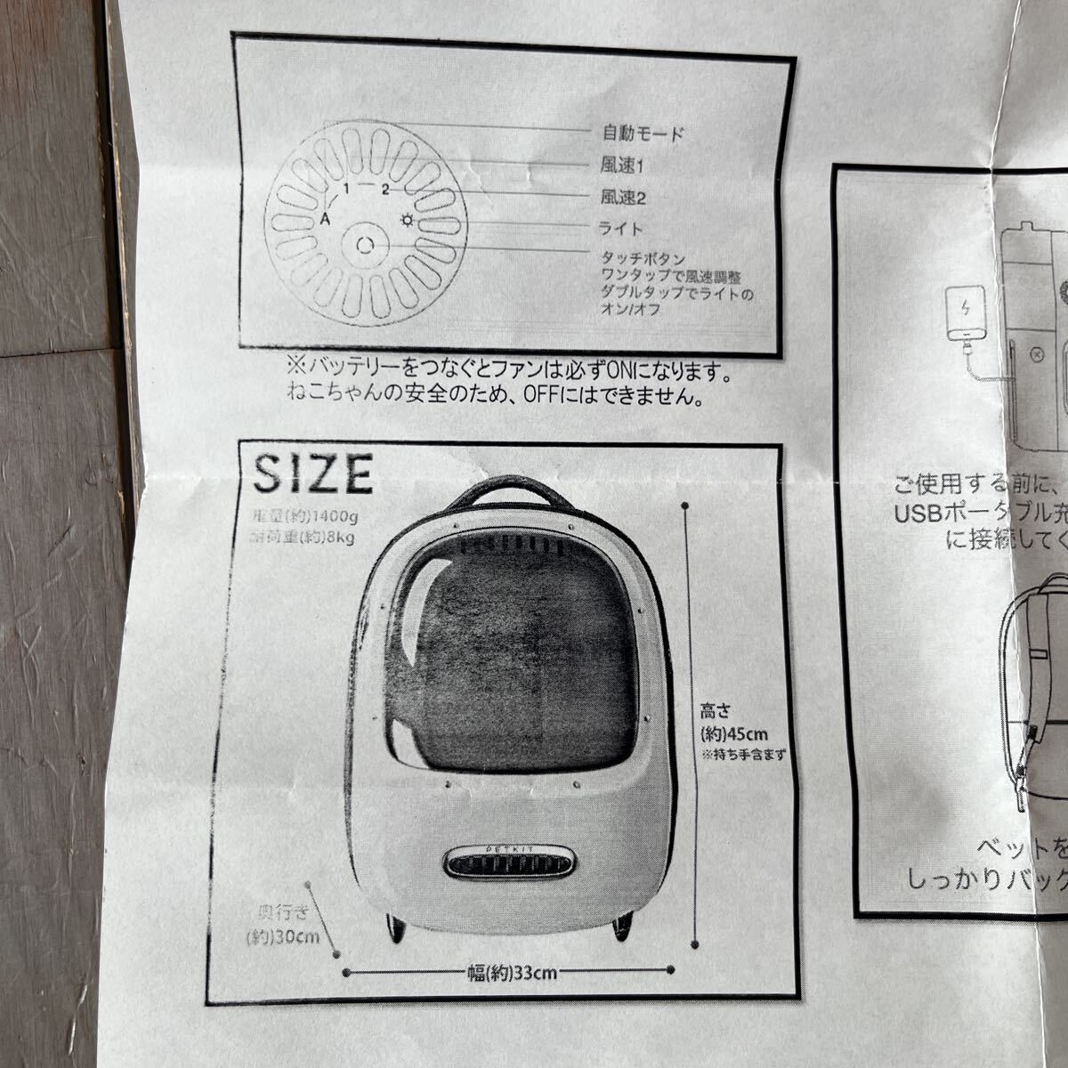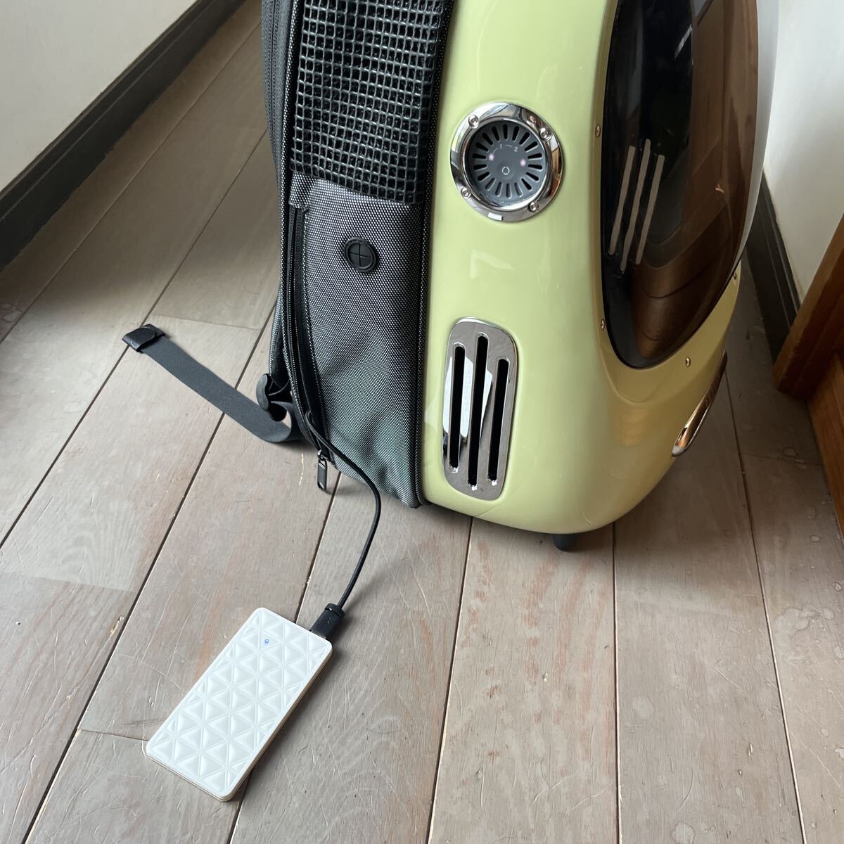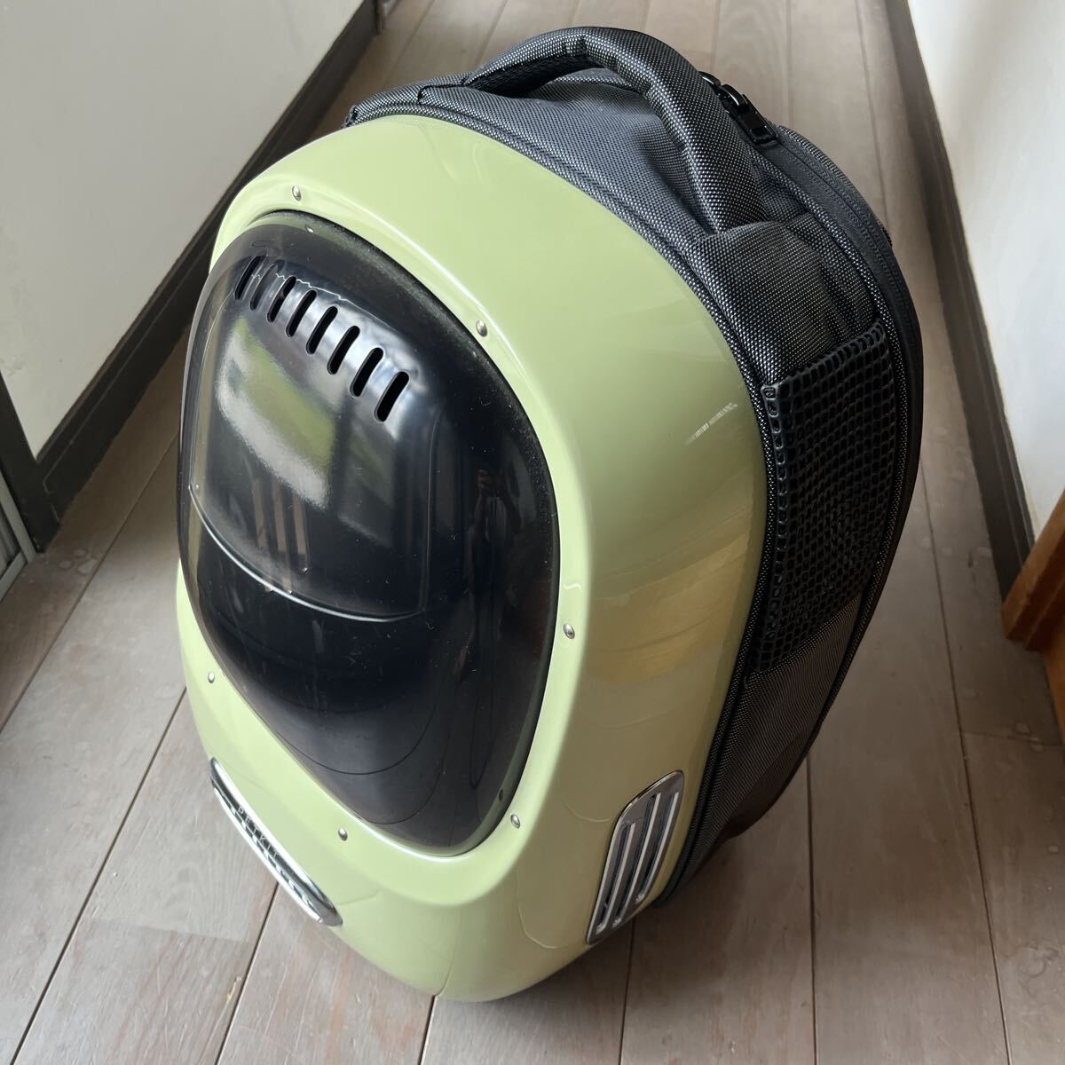 ご覧いただきありがとうございます。ペット用のキャリアです。8kg以下の猫、小柄な犬を入れることが出来ます。屋内で1回使用しただけです。自宅保管のため小さな傷やスレはありますが使用に支障の出るダメージはありません。USBーAのモバイルバッテリーを繋ぐと内臓のファンやライトを動かすことができます。