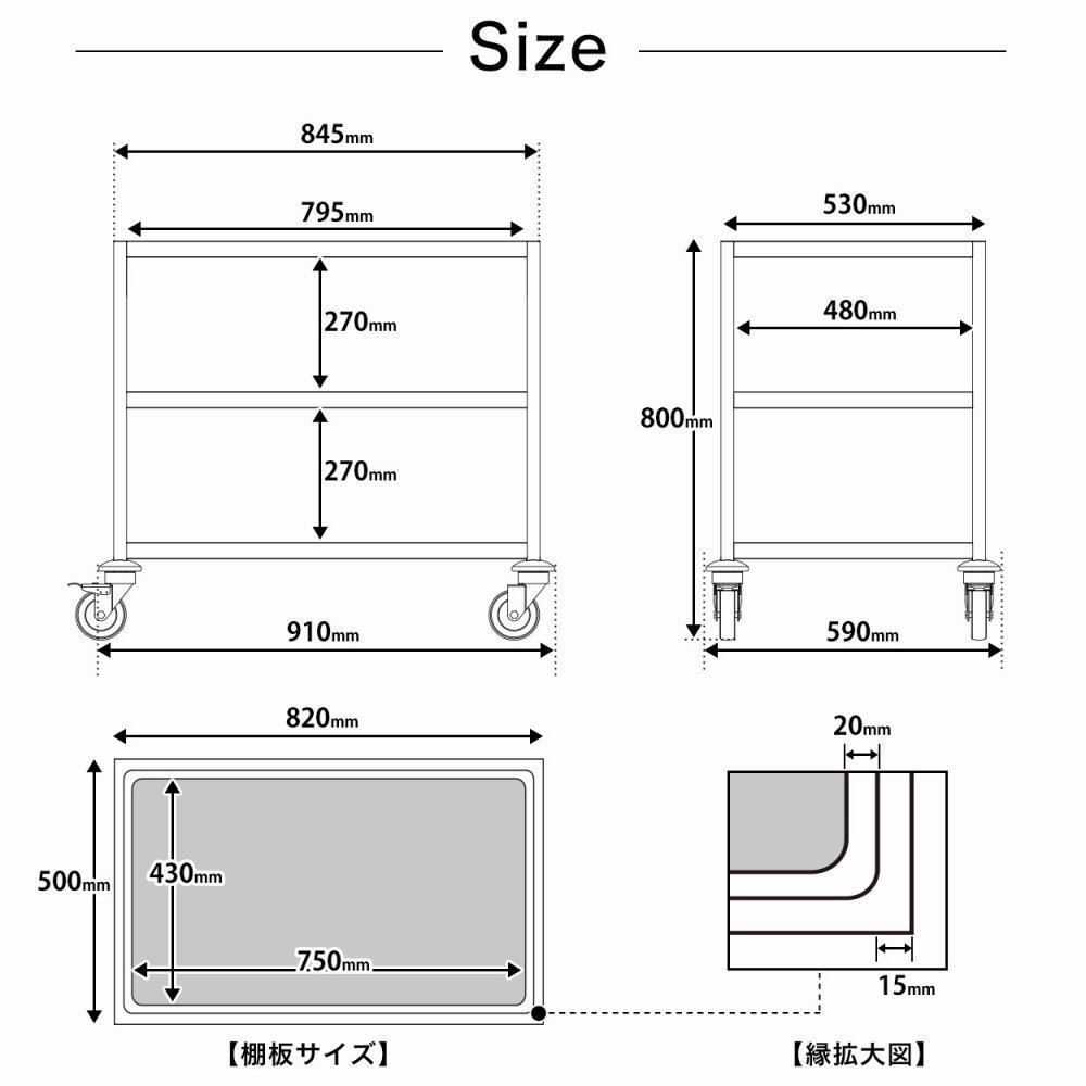 | 仕様 | 3段 フラットタイプ、キャスター4輪自在、2輪ストッパー付 |