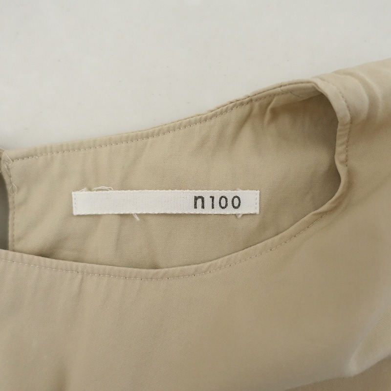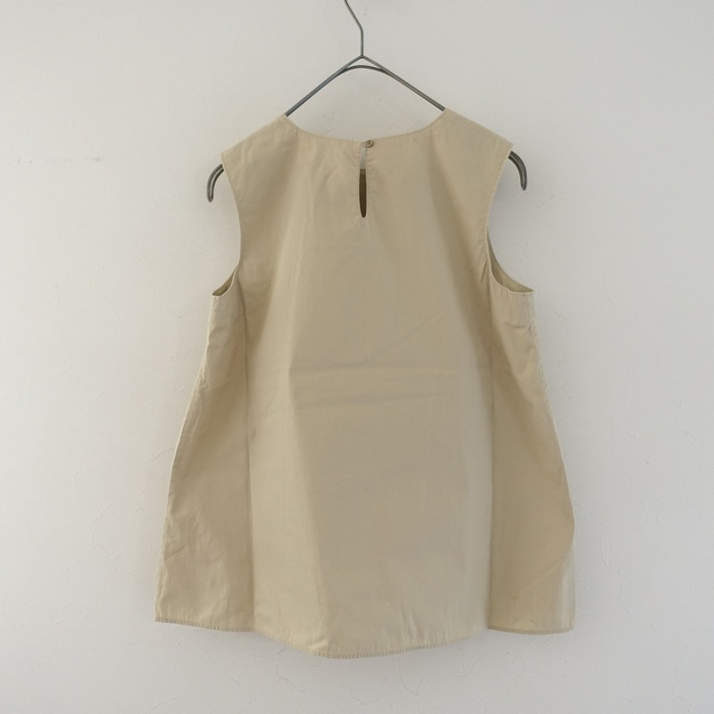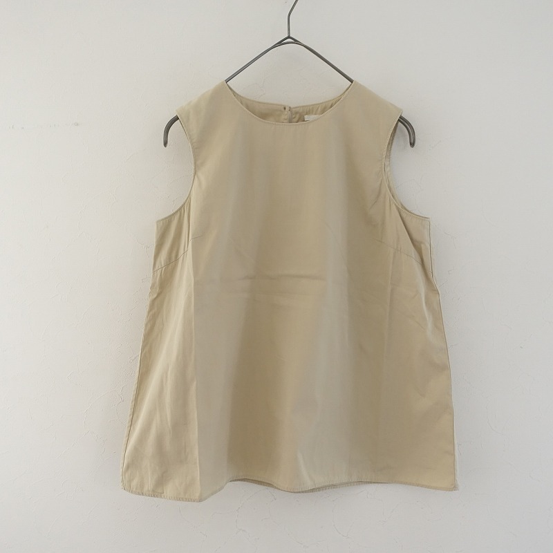 | n100の高密度コットンタンクトップブラウスです。カラーはライトベージュです。コットンの高密度に織りたてられた薄手の生地を使用。うっすら透け感があり、ハリ・コシ・艶のある素材です。背部1ボタン涙開きの着脱です。バストダーツ入り、少しAラインのシルエットです。ポケットはございません。 |