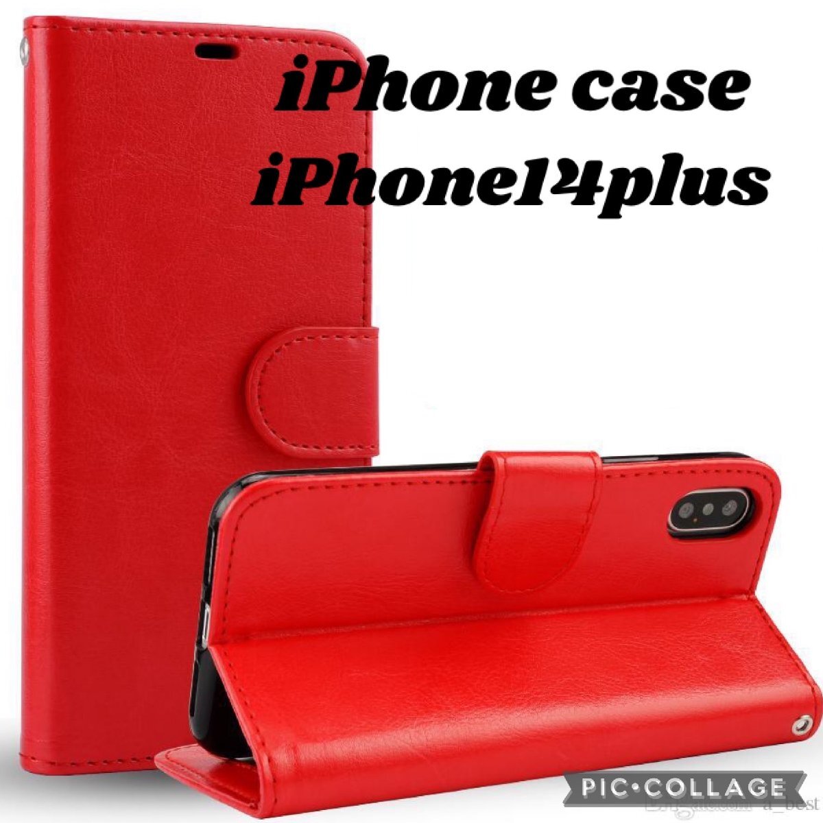 送料無料 スマホケース 手帳型 iPhone 14 Plus レザー 手帳 本革調 高品質 カード収納 レッド