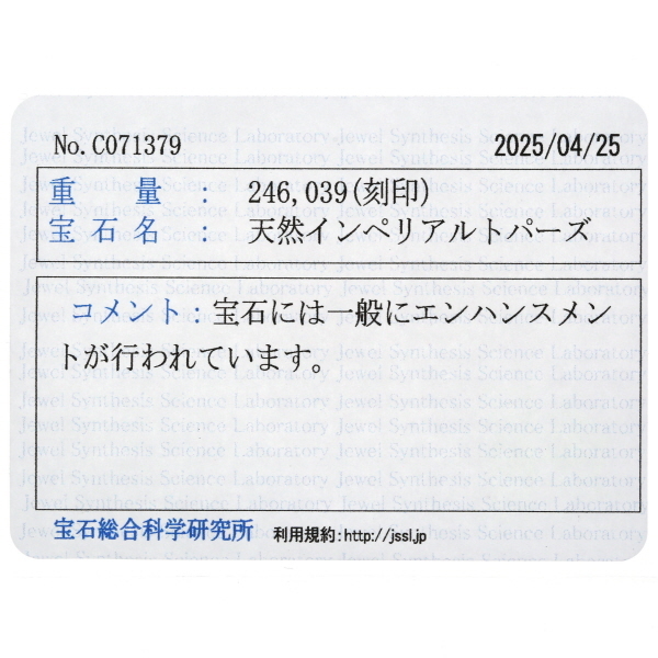 | 石目 | インペリアルトパーズ2.46ct ダイヤモンド0.39ct |