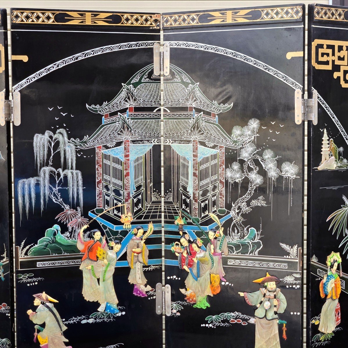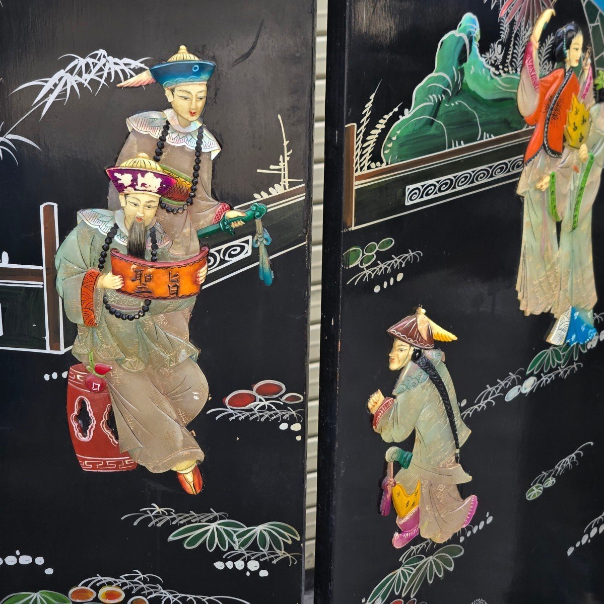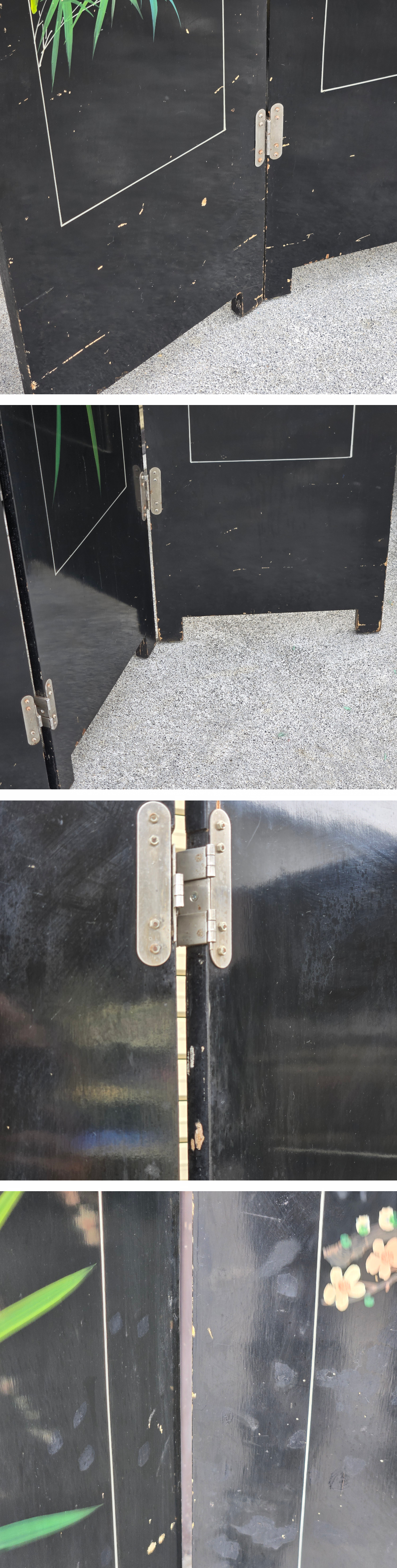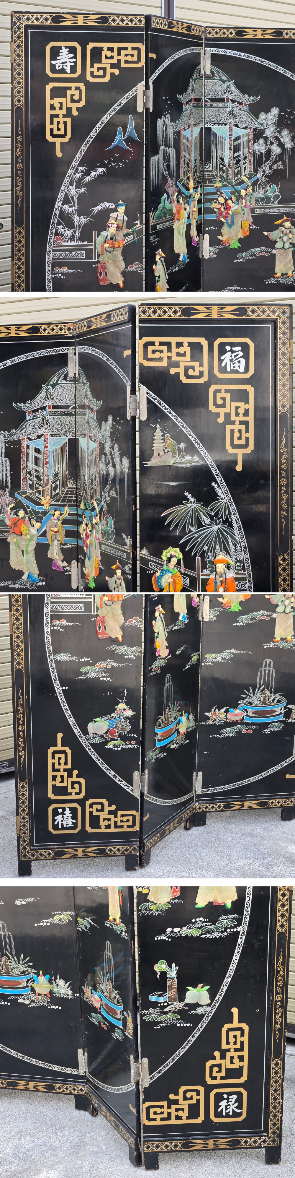 | ▼商品名 | 黒漆 玉石螺鈿装飾 楼閣人物図 屏風 四曲一隻 衝立 中国古美術 中国美術 伝統工芸 骨董 アンティーク 幅 約1840mm 高さ 約1830mm |