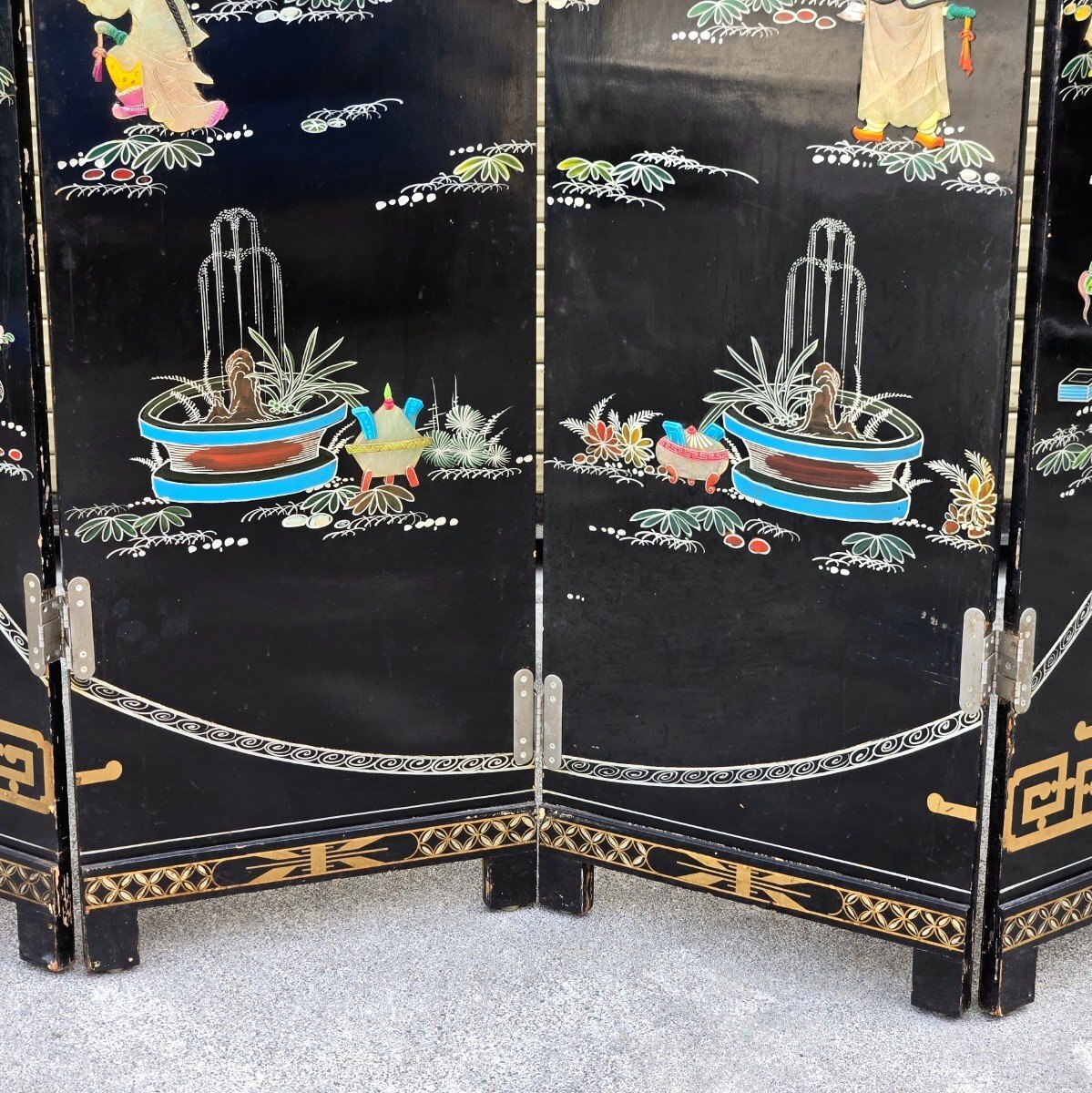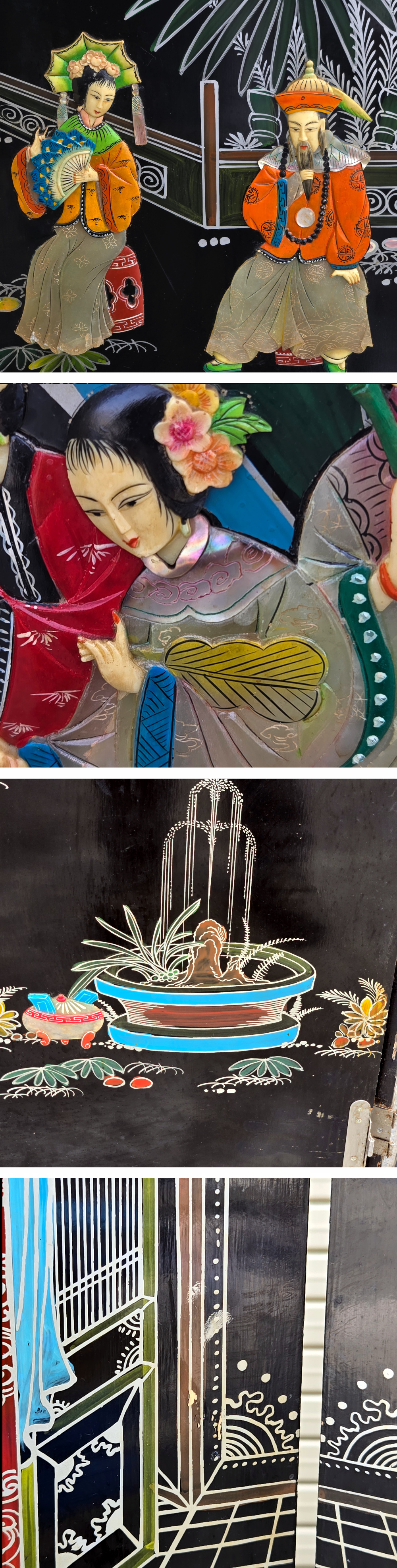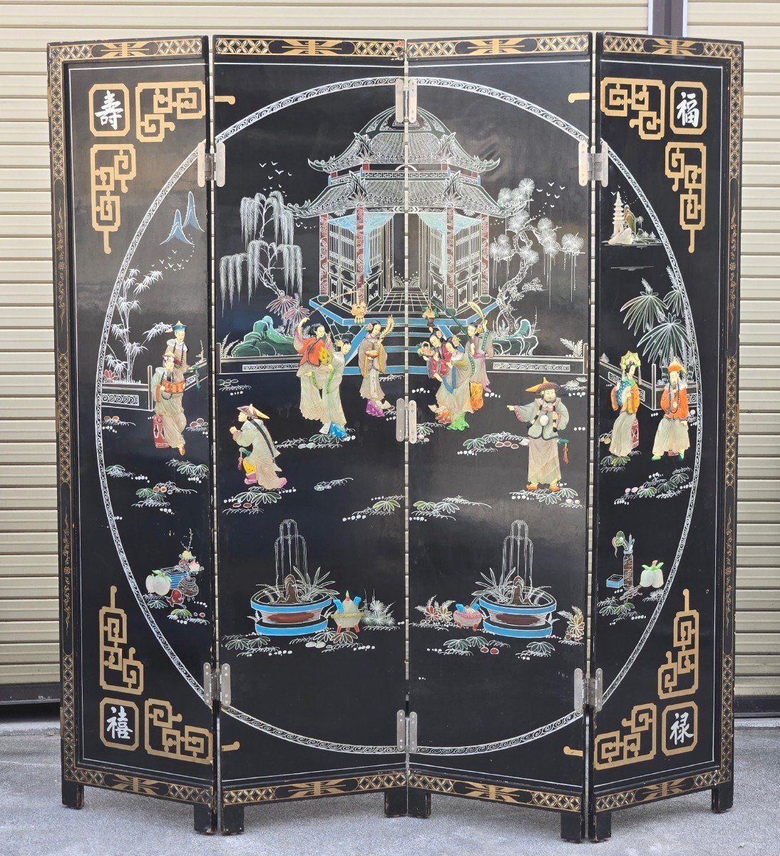 | ▼商品名 | 黒漆 玉石螺鈿装飾 楼閣人物図 屏風 四曲一隻 衝立 中国古美術 中国美術 伝統工芸 骨董 アンティーク 幅 約1840mm 高さ 約1830mm |