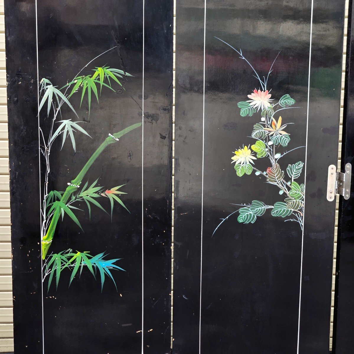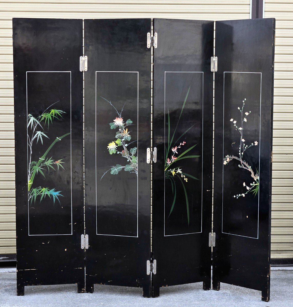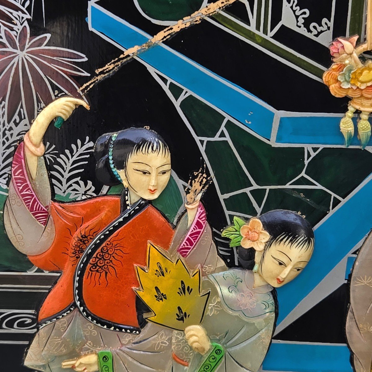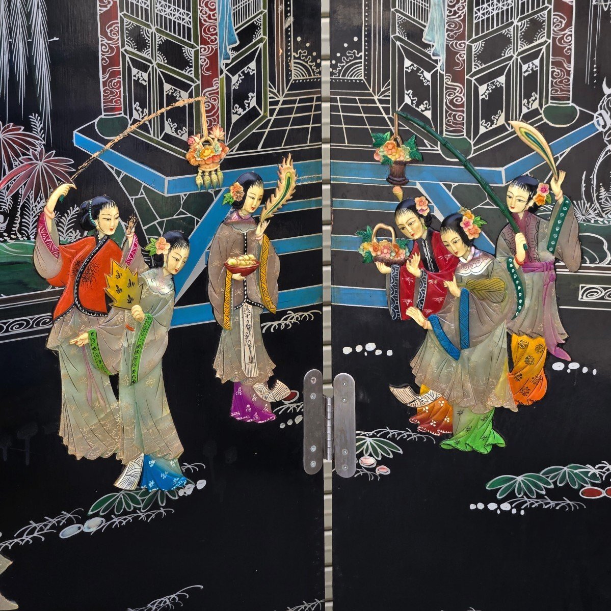 | ▼商品名 | 黒漆 玉石螺鈿装飾 楼閣人物図 屏風 四曲一隻 衝立 中国古美術 中国美術 伝統工芸 骨董 アンティーク 幅 約1840mm 高さ 約1830mm |
