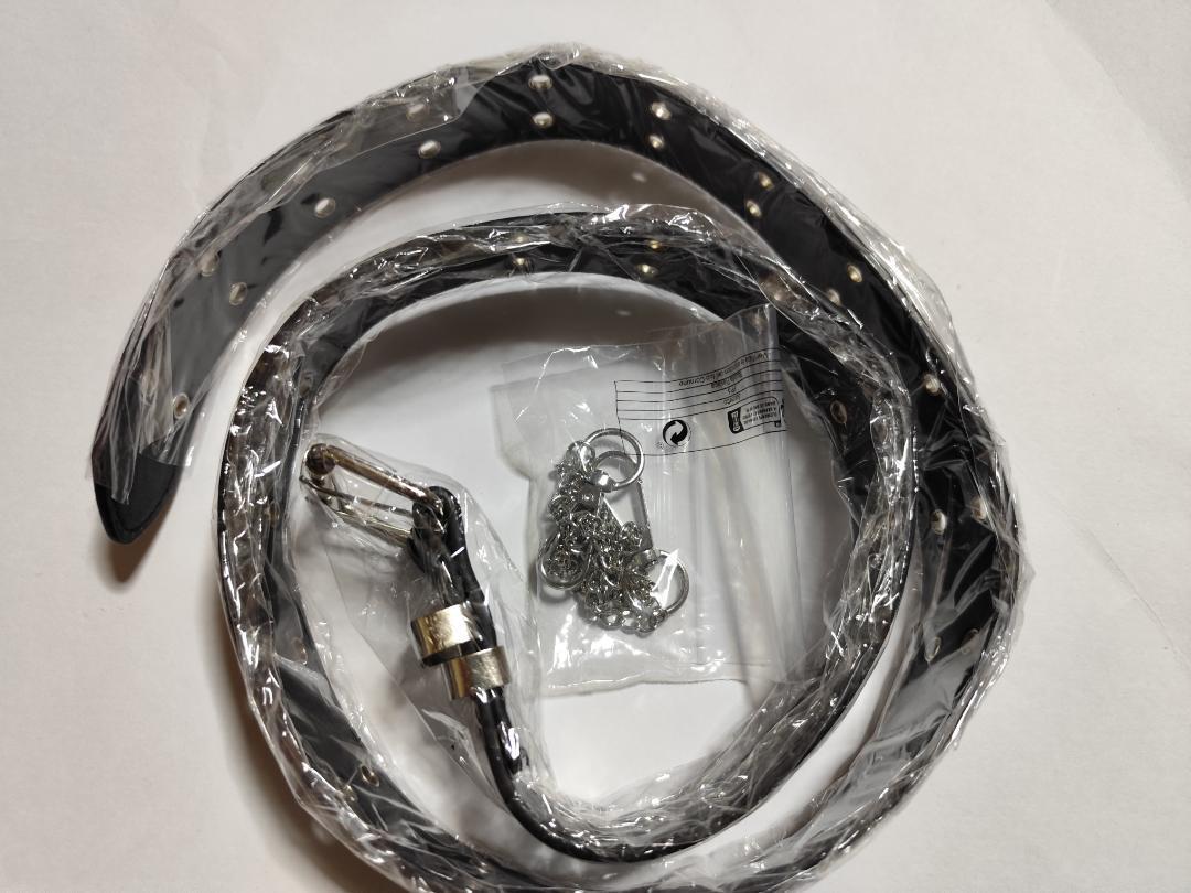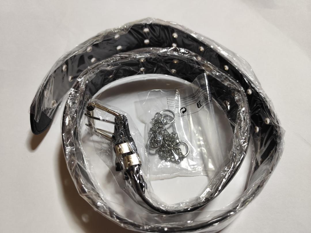 エッジの効いたスタイルにぴったりの、チェーン付きダブルバックルベルトです。ブラックのベルトにシルバーのハトメとチェーンがクールな印象を与えます。