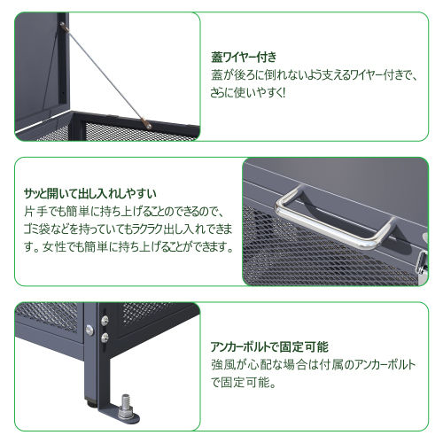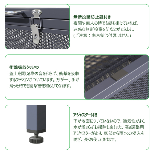 • 【無断投棄防止鍵付き】夜間や無人の時でも鍵を掛けていれば、迷惑な無断投棄を防ぐことができます。南京錠を取付可能!(ご注意:南京錠は付属しません)