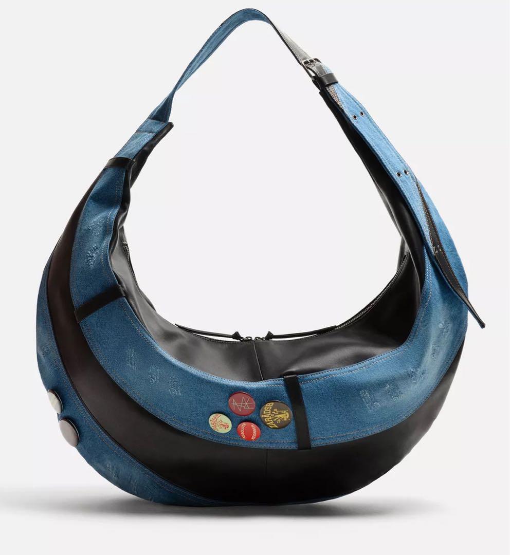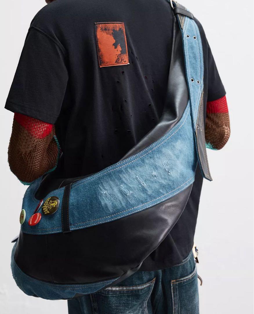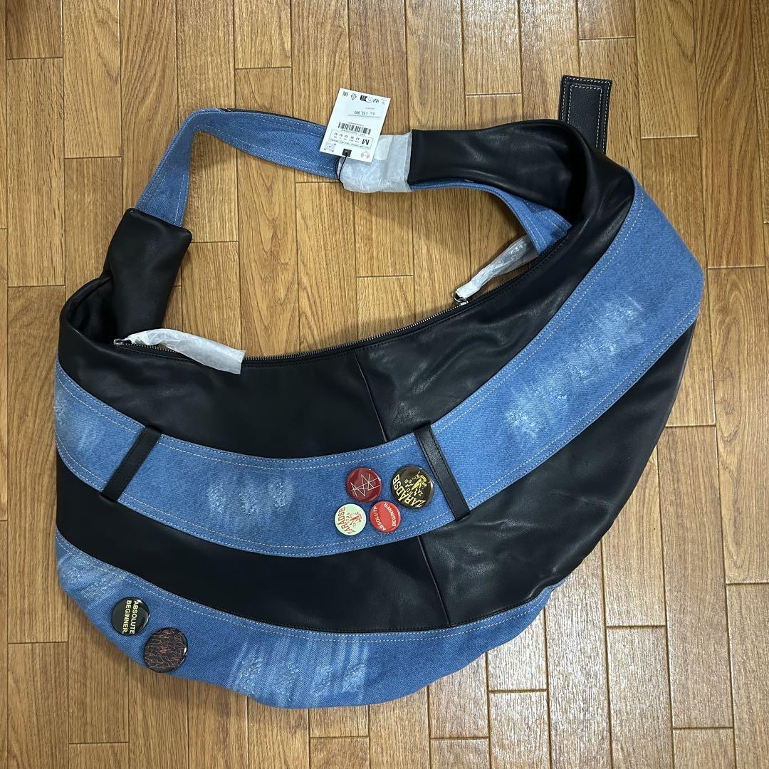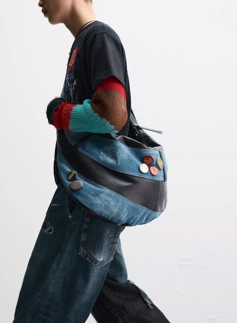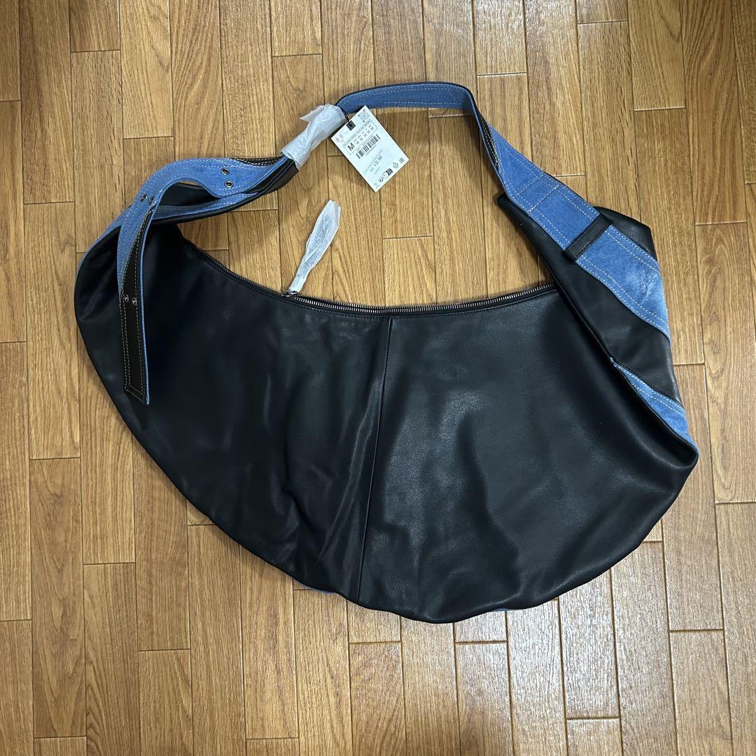 - ナッパレザーとデニム生地を組み合わせたショルダーバッグ。