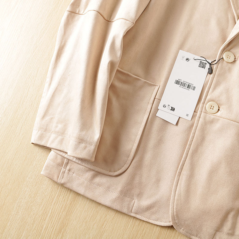・ テーラードジャケット・ノッチドラペルデザイン:テーラードジャケットのシルエットに、ノッチドラペルの襟デザインを採用。ビジネスシーンでもカジュアルな雰囲気でも自然に溶け込み、上品な印象を与えます。