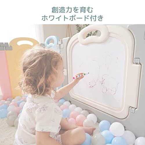 「知育玩具&お絵描き」他のベビーガードとは違い、パネルの1枚には赤ちゃんの脳の発達を促す、5種類の知育玩具を設置しております。またゲートの裏はホワイトボードになっていて、落書きも自由にできます。