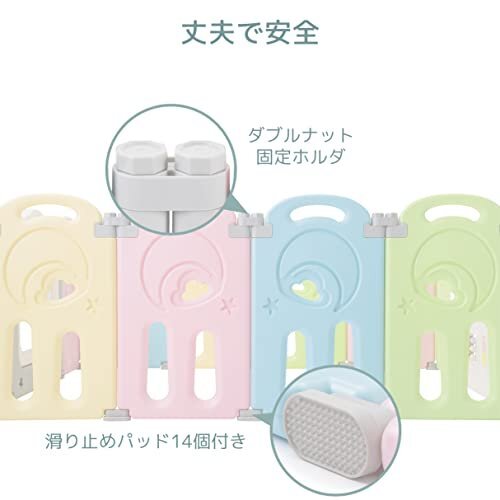 「安全&安心」パネル同士をつなぐ頑丈な14個のヒンジと、滑り止めパッドがついてしっかりと固定できます;外からロックできるドアパネルでお子様の安全を守ります。