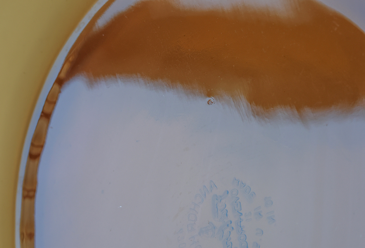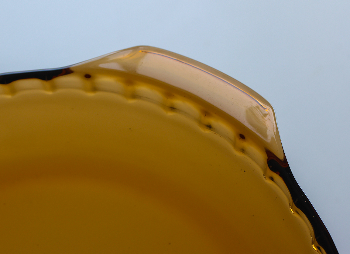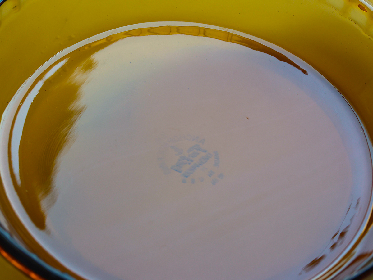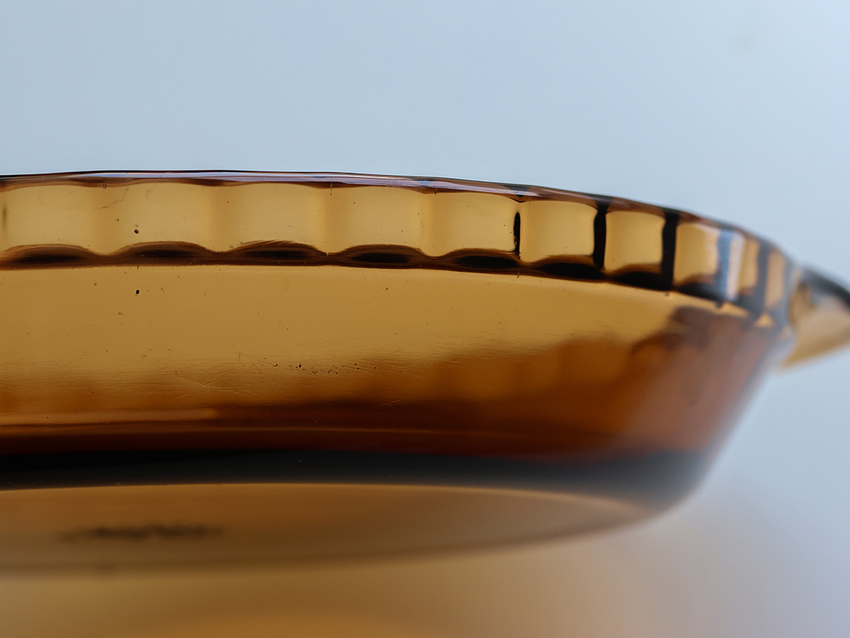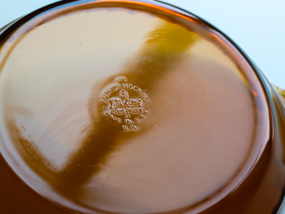 【商品の状態】 ★★★★★★ 製造年:1960年~1970年代 直径: 29cmx25.3cm 高さ: 4.8cm とても状態の良いファイヤーキングの耐熱ガラス製のアンバーカラーのパイプレートです。 ヒビ、カケなく、ツヤがあり、使用感もなくミントコンディションです。リムのざらつきもなくとても艶やかで綺麗な状態です。 底にはファイヤーキングの刻印があります。 60サイズでの発送となります。送料は料金表をご確認くださいませ。L60-8 |