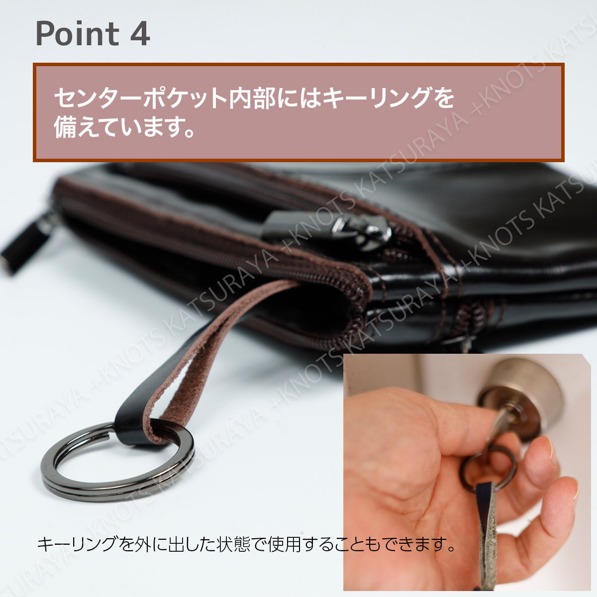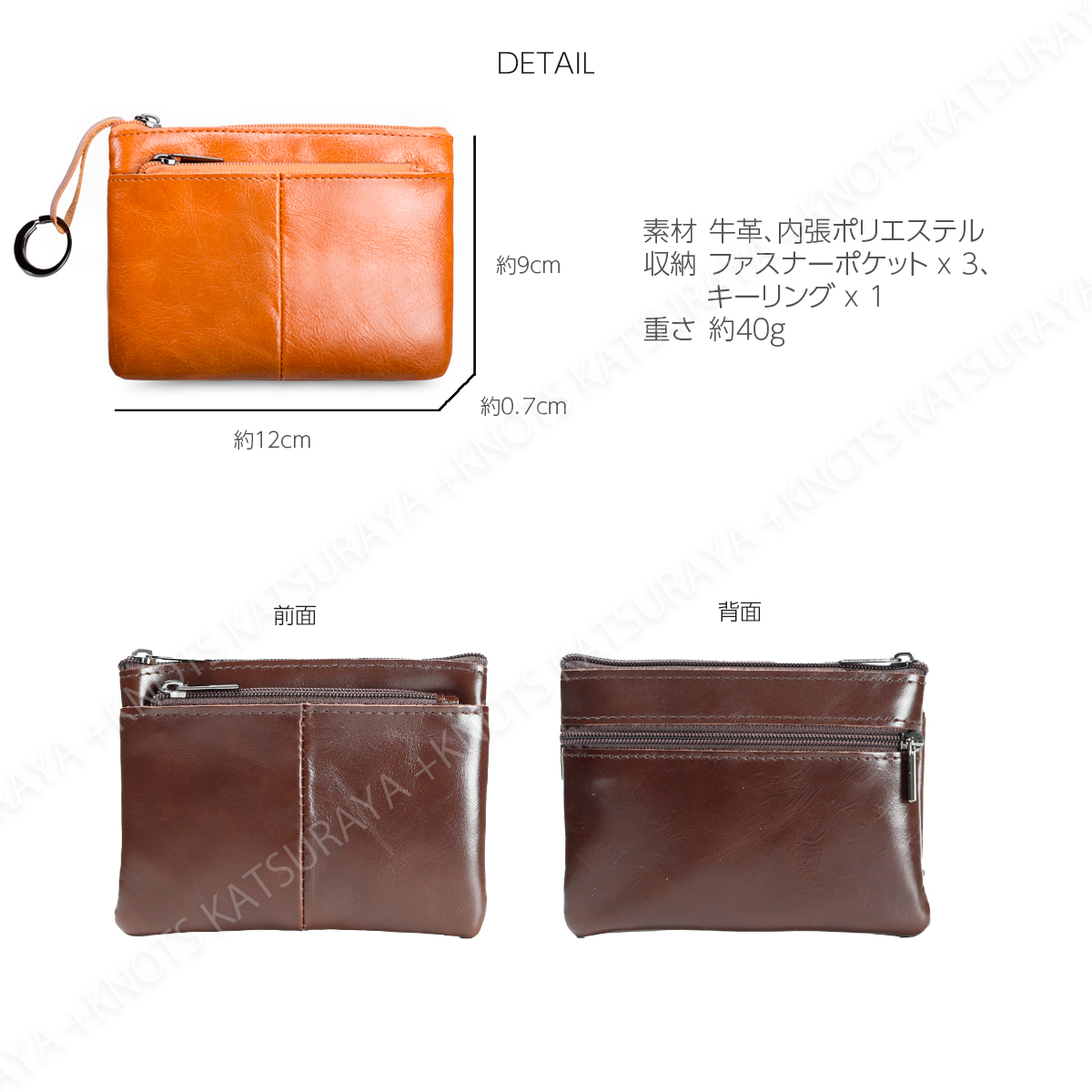 収納:ファスナーポケット x 3、キーリング x 1、