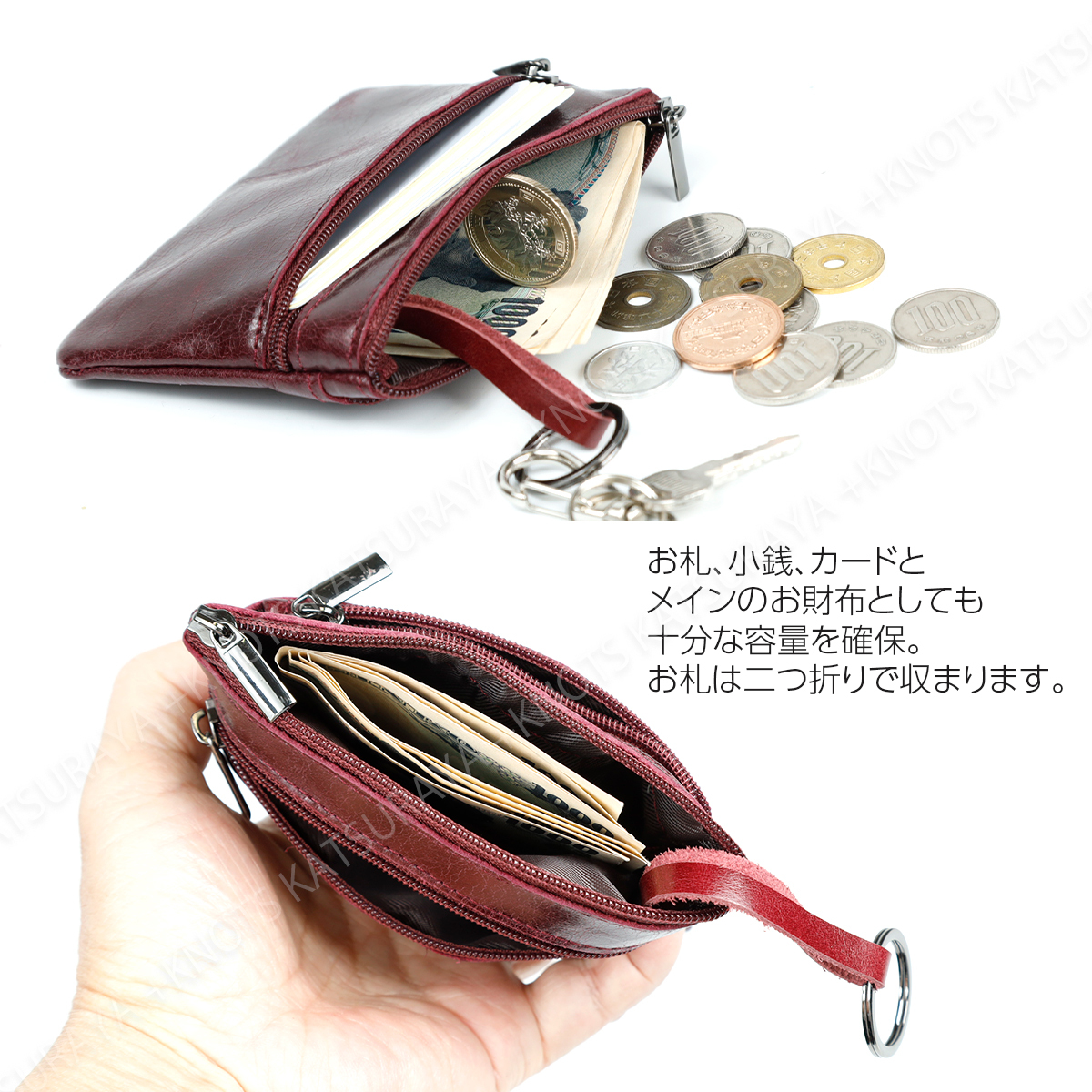 やわらかくやさしい質感の本革を使用した、ちょっぴりレトロで使いやすいミニ財布です。3つのファスナーポケットを装備し用途ごとに使い分けできます。センターのメインポケット内にはキーリングを配置。キーリングはファスナー内にしまうことも表に出した状態でも使用できますので、鍵を付けるほかに財布を壁掛けにするなどの用途にも便利です。シンプルで素朴なデザインなので性別年齢問わずおすすめのアイテムです。