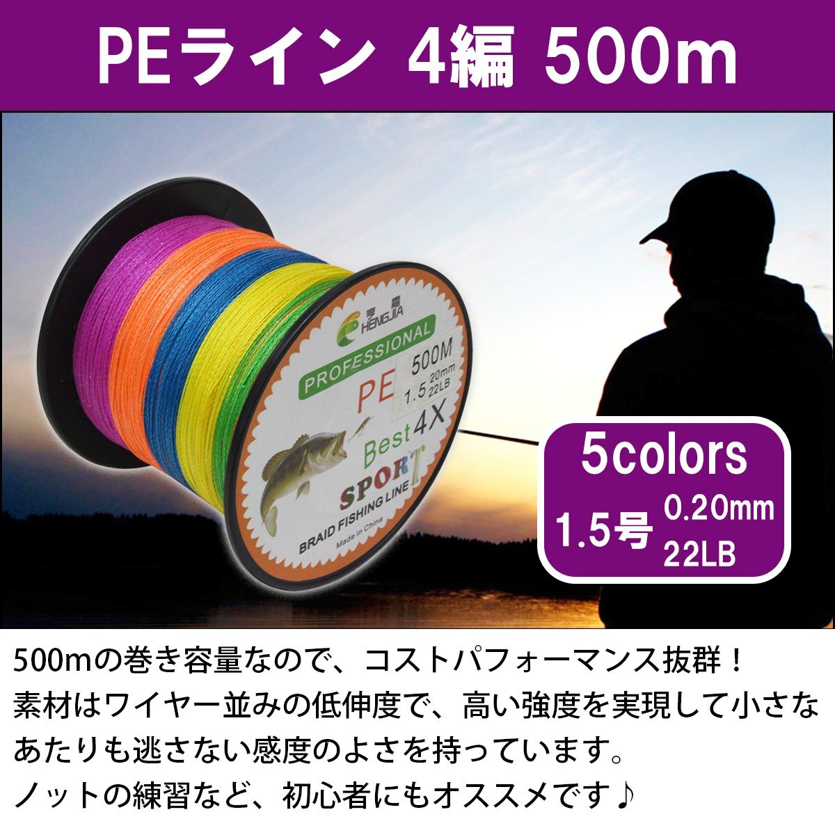 【新品即納】釣り糸 500m PEライン 1.5号/22lb 5色 マルチカラー MIX 投げ釣り 船釣り ジギング ルアー エギング タイラバ リール