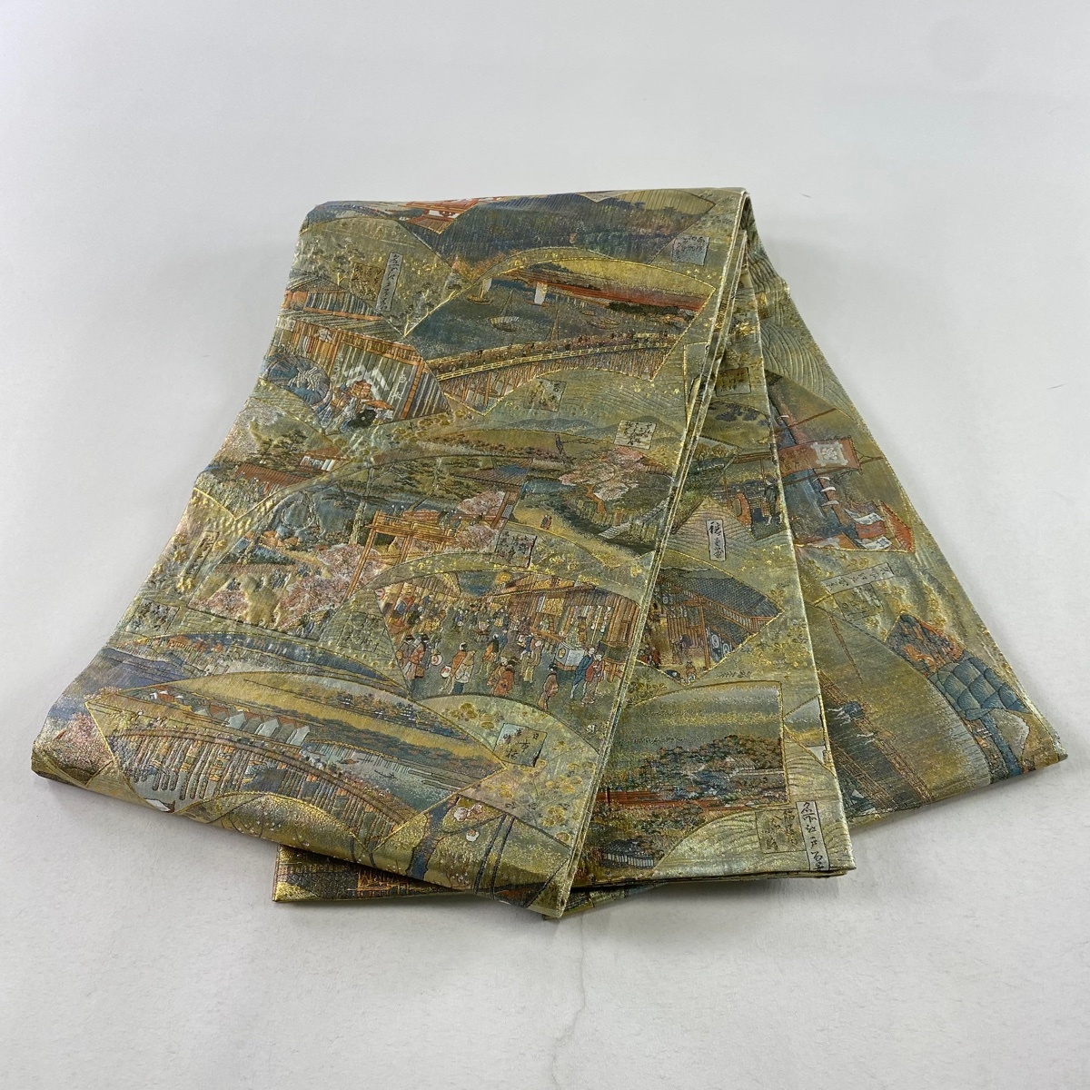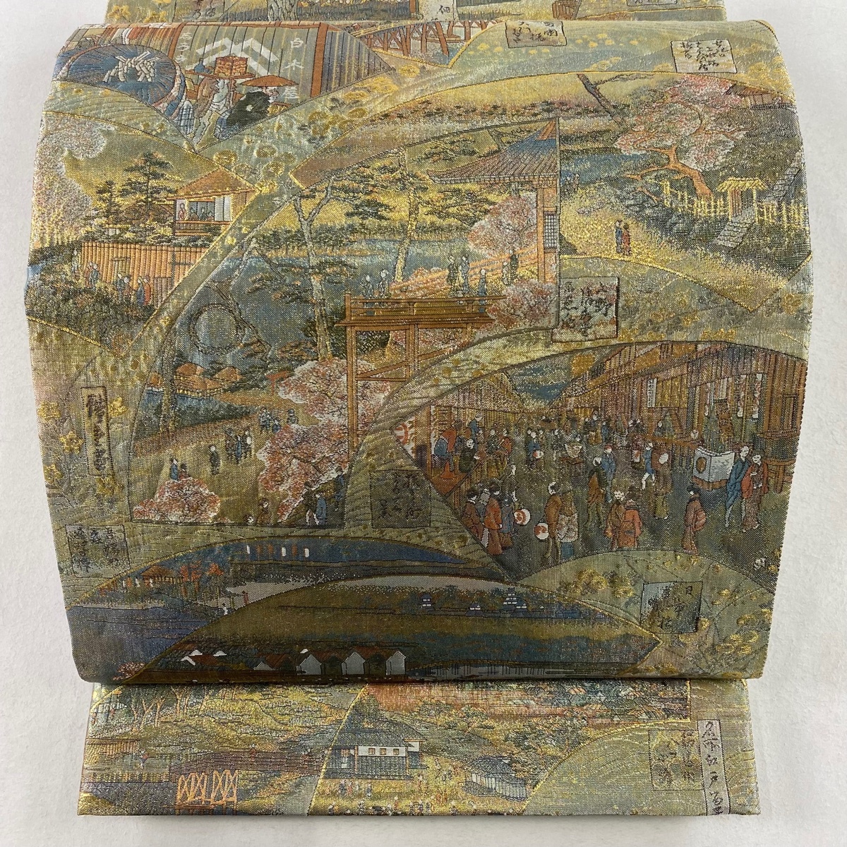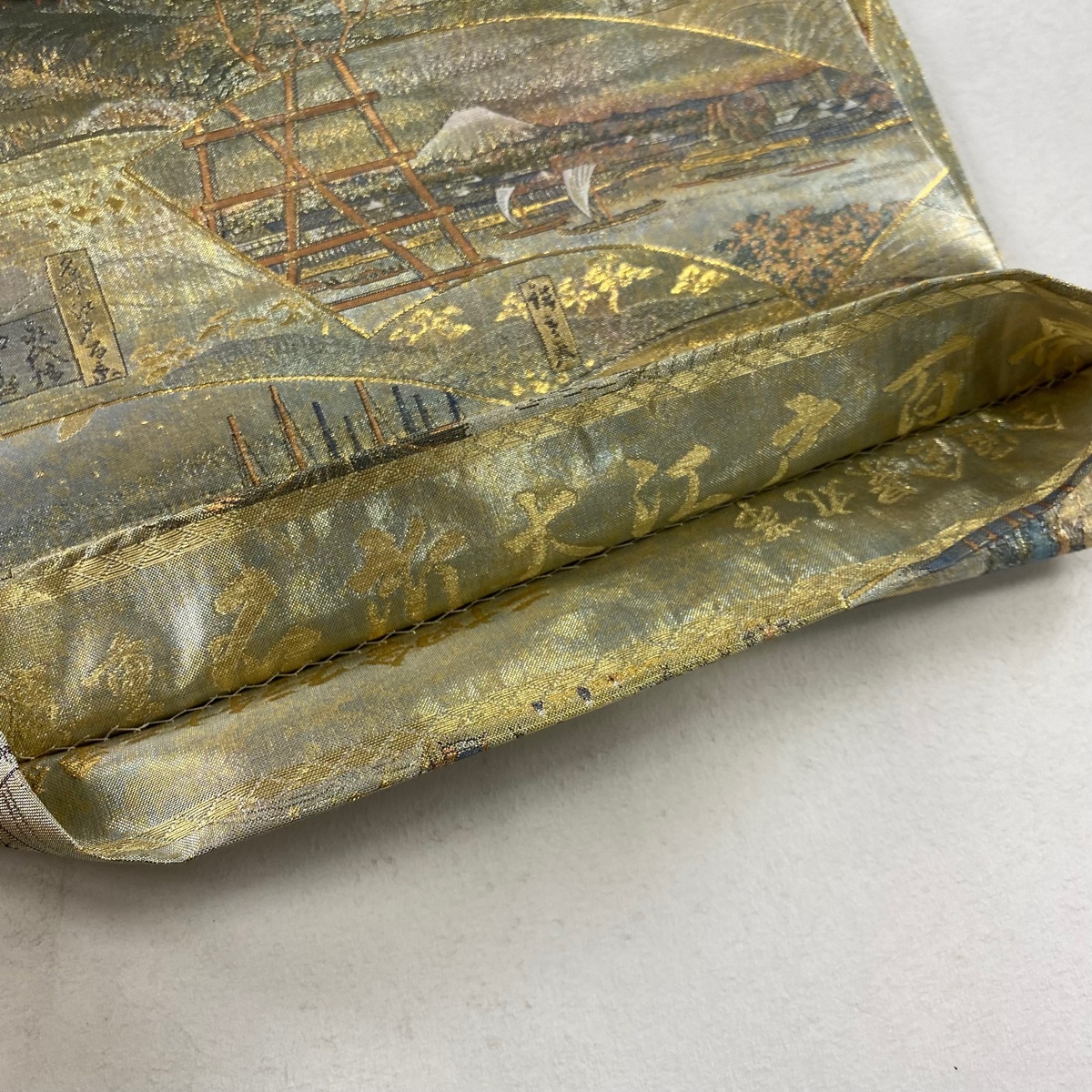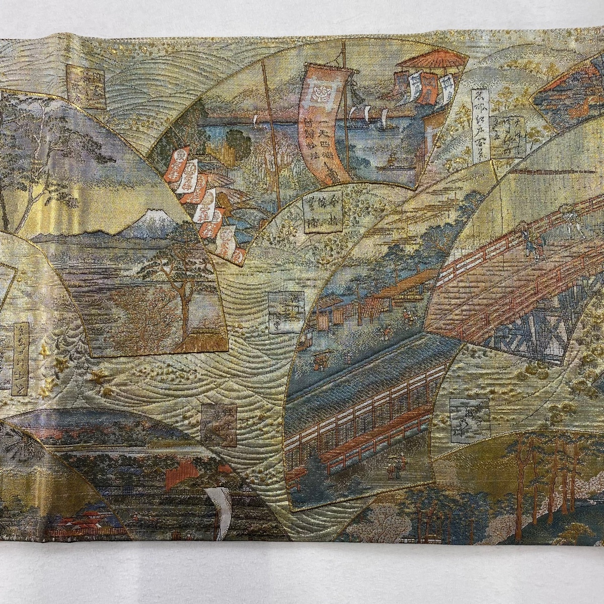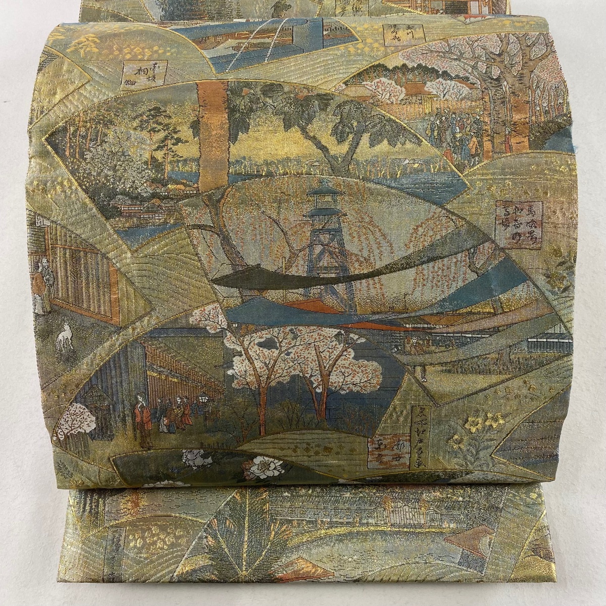 | 丸帯 美品 逸品 廣重 名所大江戸百景 風景 扇面 箔 金色 お太鼓柄 正絹 【中古】 |