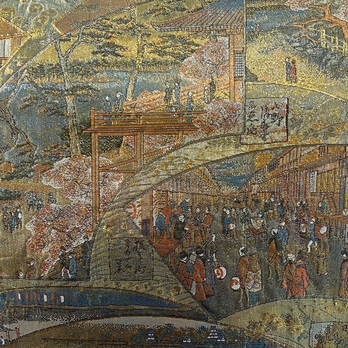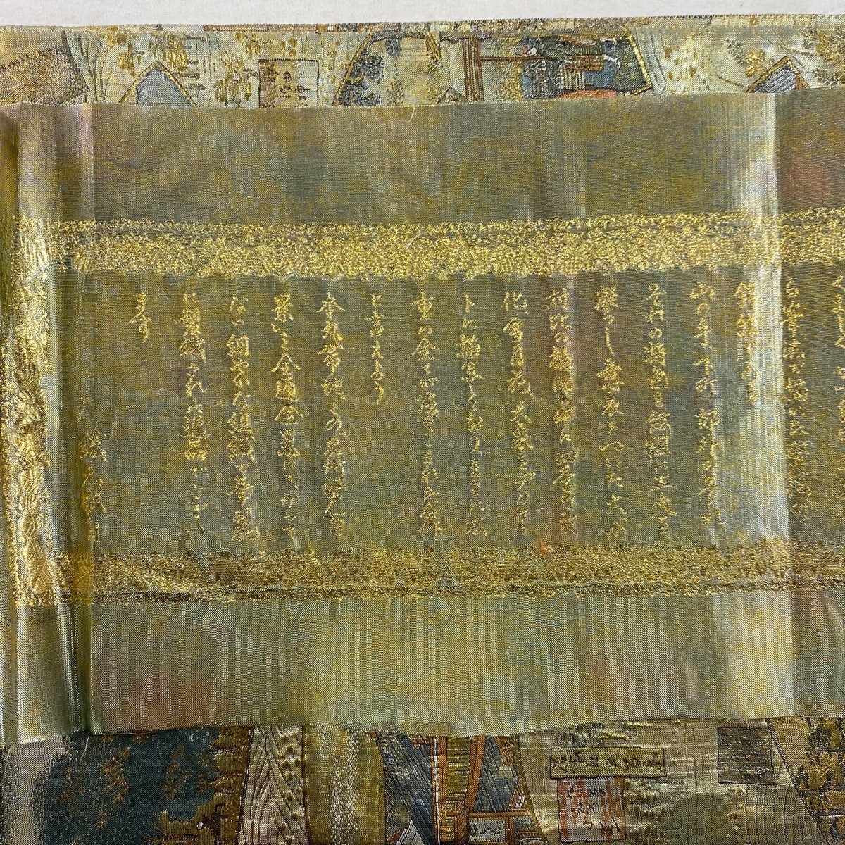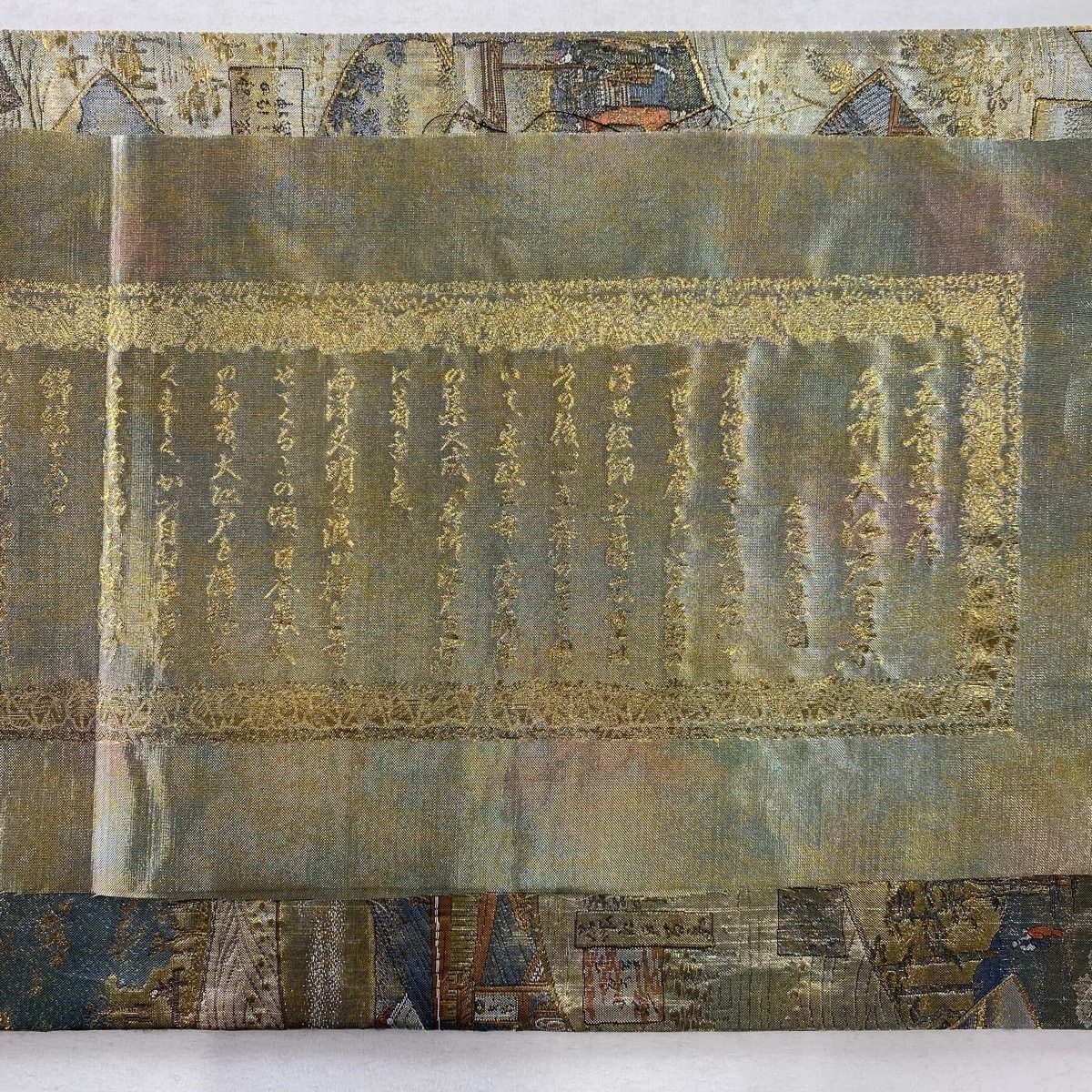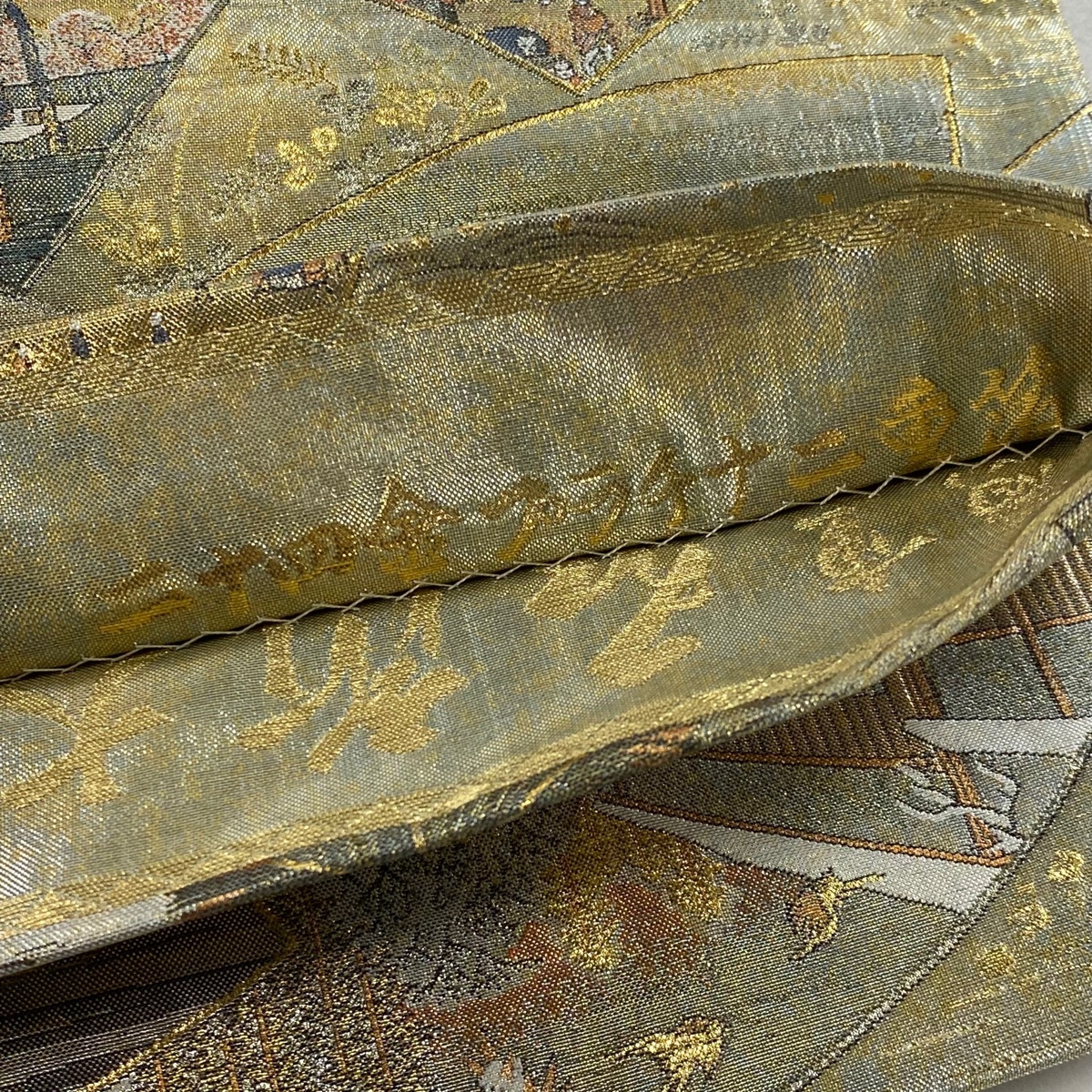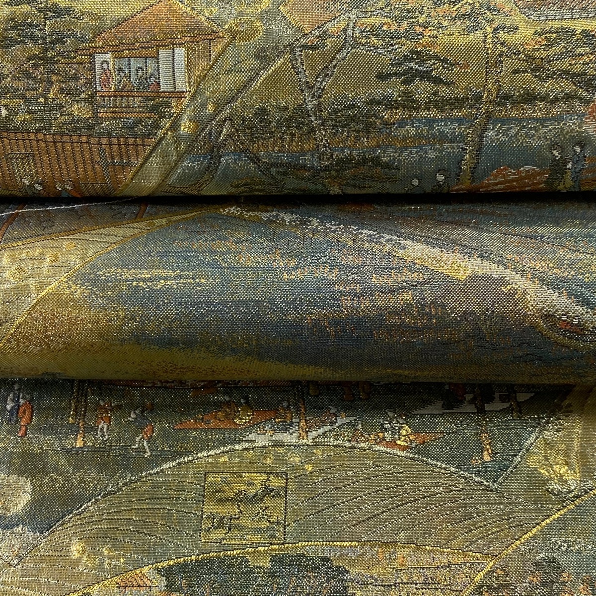 | 丸帯 美品 逸品 廣重 名所大江戸百景 風景 扇面 箔 金色 お太鼓柄 正絹 【中古】 |