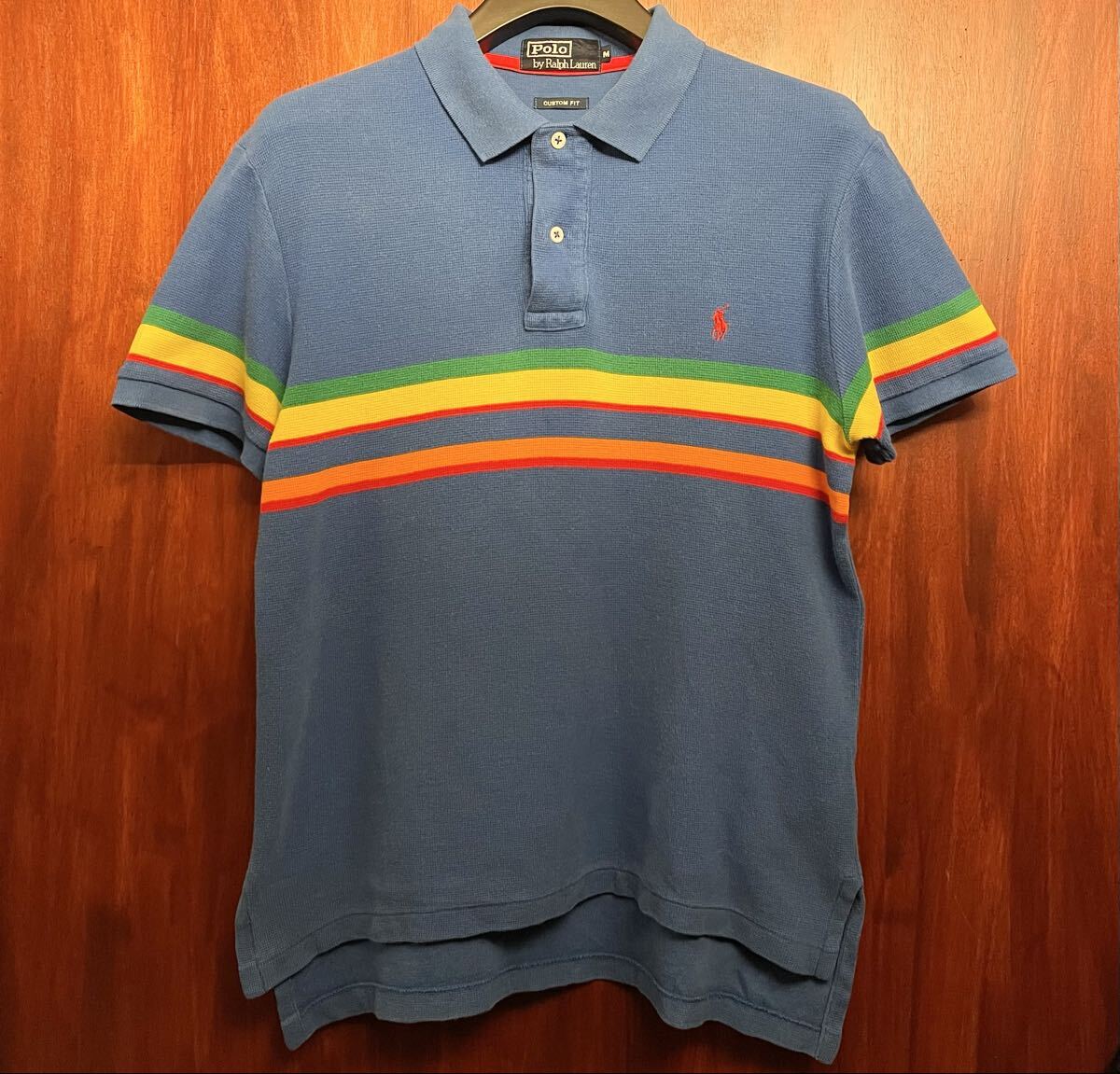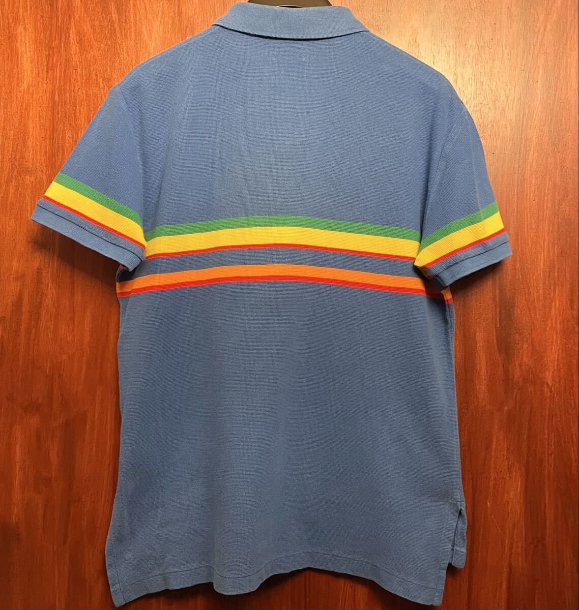 定番の鹿の子ポロシャツではなく、凹凸感のあるサーマルのようなニット生地を使っているので動きやすくて着心地が良く、ブルーのボディにレインボーカラーのボーダー柄がアクセントになったオシャレなおすすめの一品です。