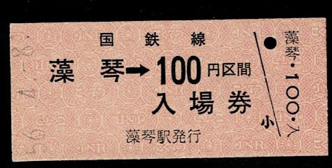 国鉄 釧網本線 藻琴駅 乗車券併用入場券 100円券 昭和56年