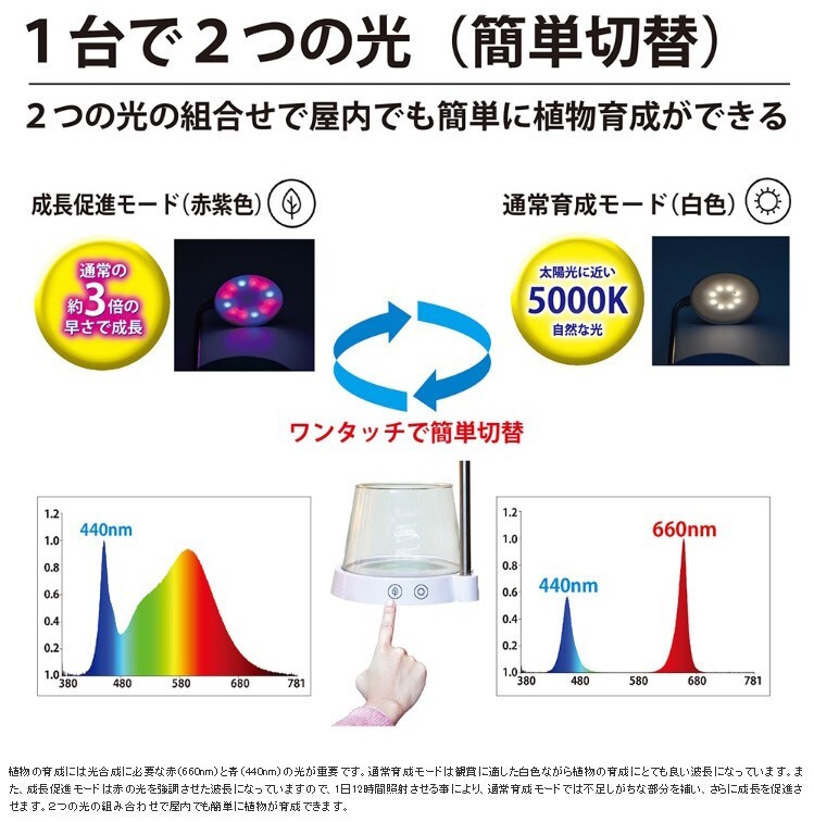 赤と青の光で育つ成長促進モードと太陽光に近い5000Kの光の通常育成モードの2種類の光の切り替えスイッチ付き。