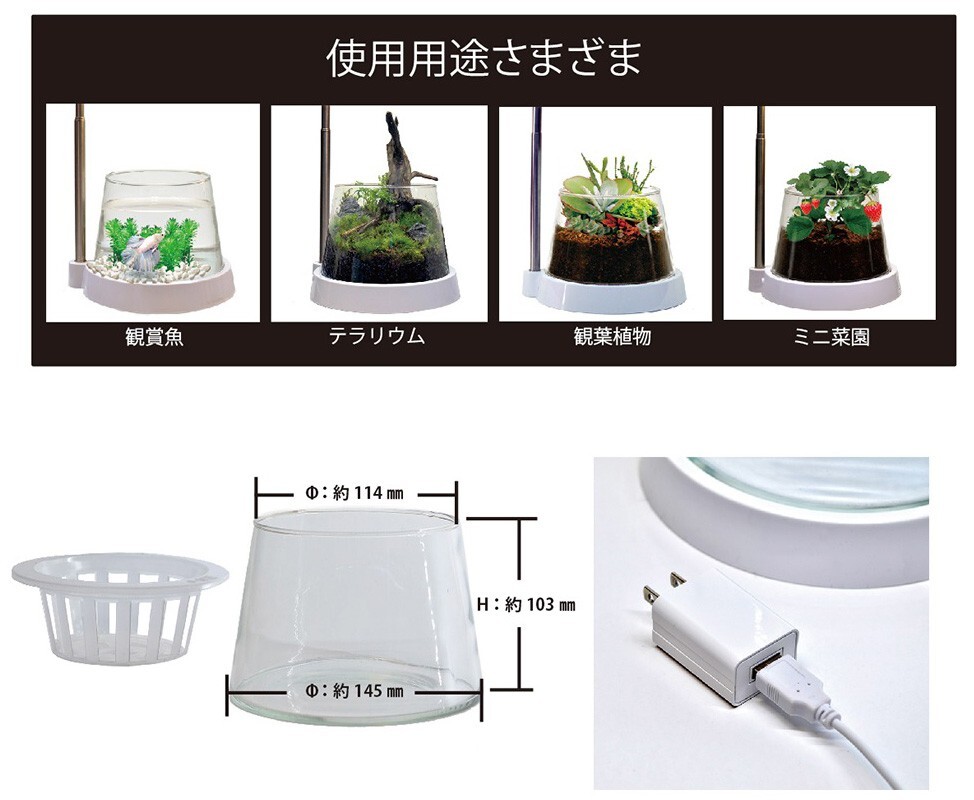 観賞魚の育成や観葉植物、テラリウム、ミニ菜園などに使える飼育容器付き多目的育成ライトです。