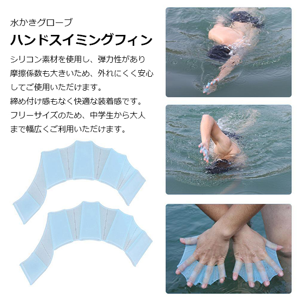 商品詳細 | 「水泳フォームを改善したい方」や「水中運動で筋トレ効果を高めたい方」におすすめの商品です! ・推進力アップ! 指の間にシリコンのフィン(膜)がついた設計で、水をしっかりキャッチし、効率的に泳げます。初心者の練習から上級者のトレーニングまで幅広く活躍します。 ・快適なフィット感 柔らかいシリコン素材を使用し、伸縮性があり手にぴったりフィット。摩擦があるため水中でも外れにくく、長時間の使用でも快適です。 ・多用途に使える 水泳のフォーム練習だけでなく、アクアビクス・フィットネス・シュノーケリング・ダイビングなどにも最適。水中での負荷を増やし、トレーニング効果を高めます。 ■商品仕様 ・素材:シリコン ・特徴:伸縮性があり、手にフィットして外れにくい ・用途:水泳練習、アクアビクス、フィットネス、ダイビング、シュノーケリング など ・サイズ:フリーサイズ(伸縮性あり) ご注意 初めてご使用になる際は短時間から慣れてください。 高温多湿・直射日光を避けて保管してください。 使用後は水洗いし、乾燥させてから保管してください。 |