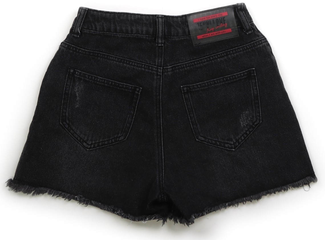 デニム地で、ダメージ加工。ウエストはサイズ調整ゴムが付いていて、前ファスナー開き。使用感は見られますが、目立った汚れはありません。