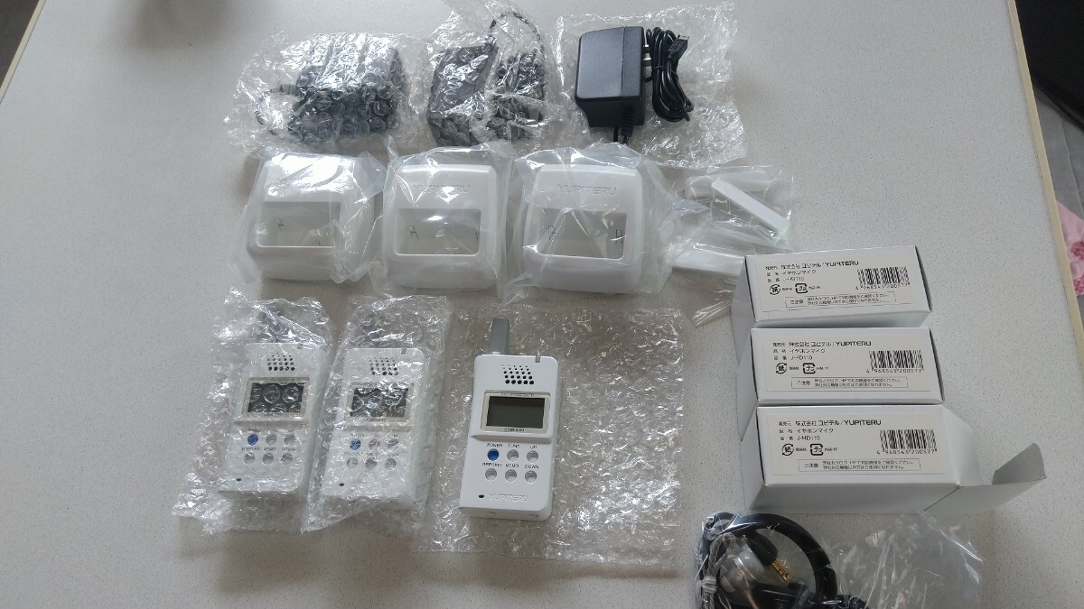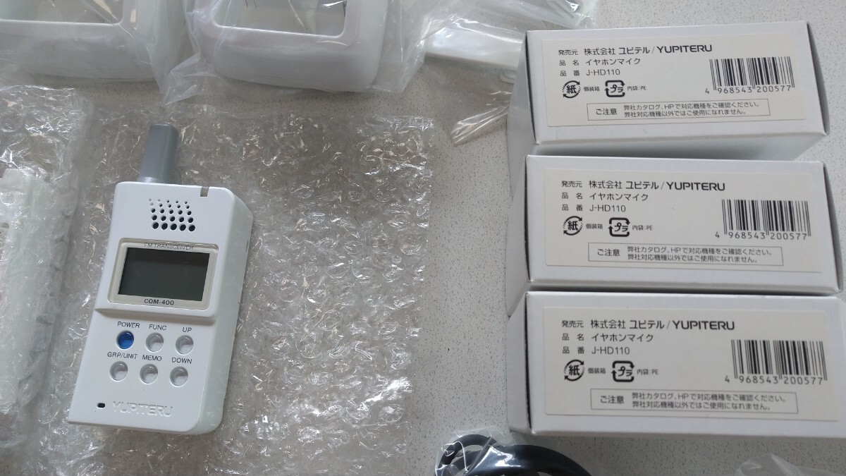 すべて未使用品です。 本体、充電台、ACアダプター、クリップ、イヤホンマイクのSETが3セットです。2台でしたら同時通話出来ます。本機は中継局(レピーター)にもなります。レピーターを使う場合は単信交信になります。詳しくはユピテルのHPの取り扱い説明書のトランシーバーより参照をお願いいたします。イヤホンマイクのマイクのスポンジが傷んでおります。在庫ありますので追加をご希望でしたら、落札後お問い合わせください。未使用品ですが保管品ですので、ノークレーム、ノーリターンでお願いいたします。