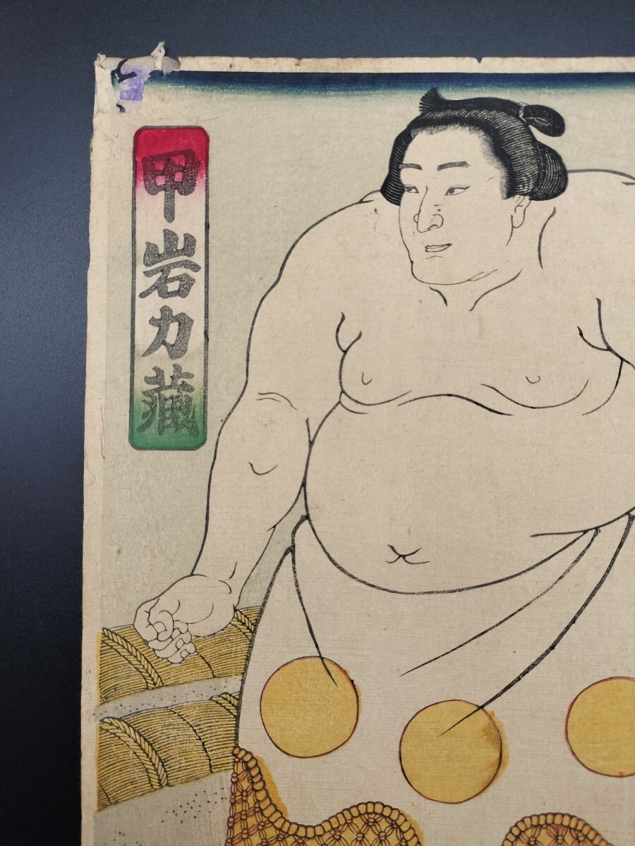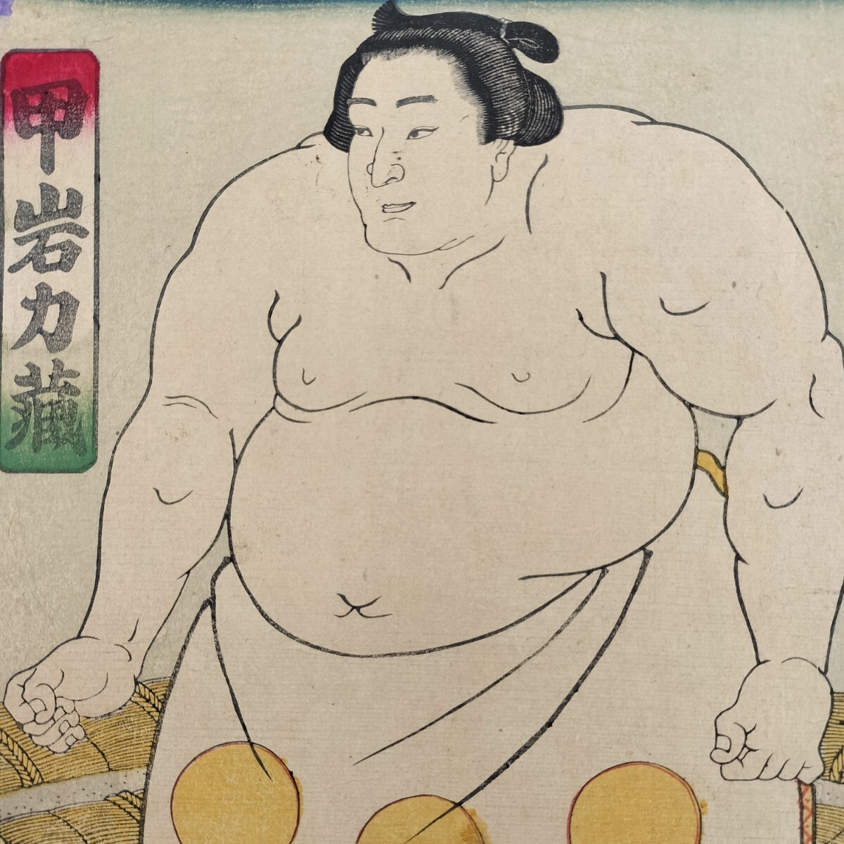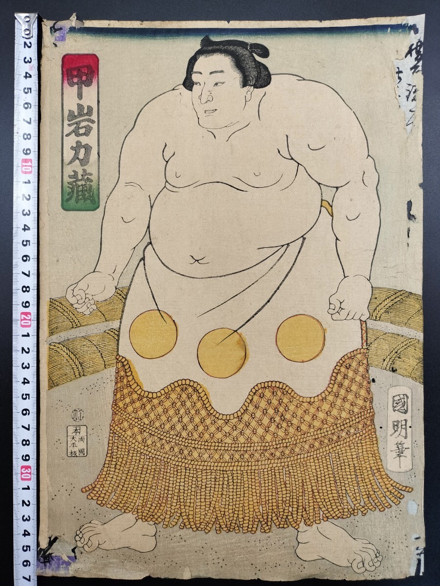 力士!明治期/真作 歌川国明「甲岩力藏」本物浮世絵木版画 相撲絵 武者絵 錦絵 大判 裏打ち