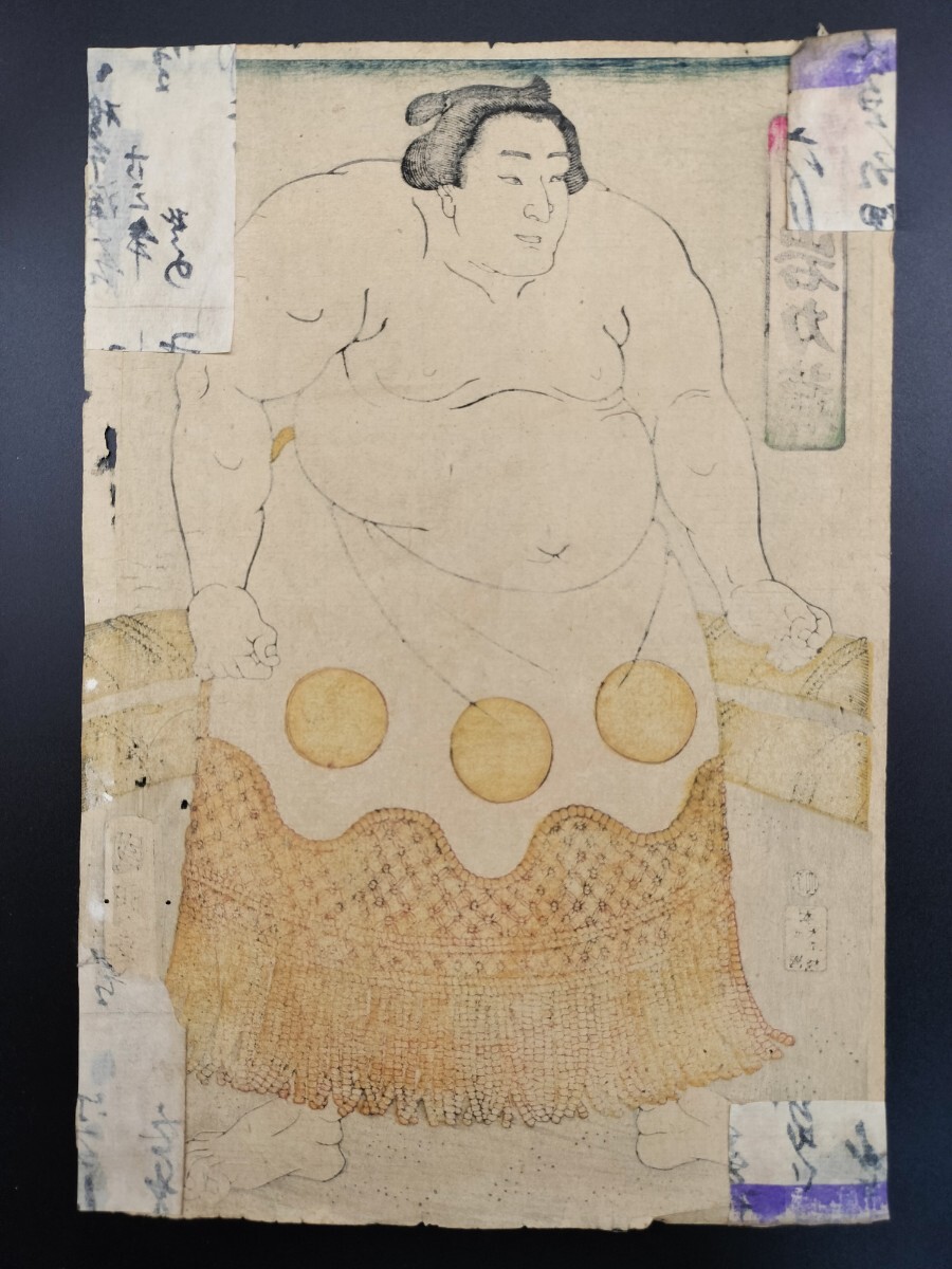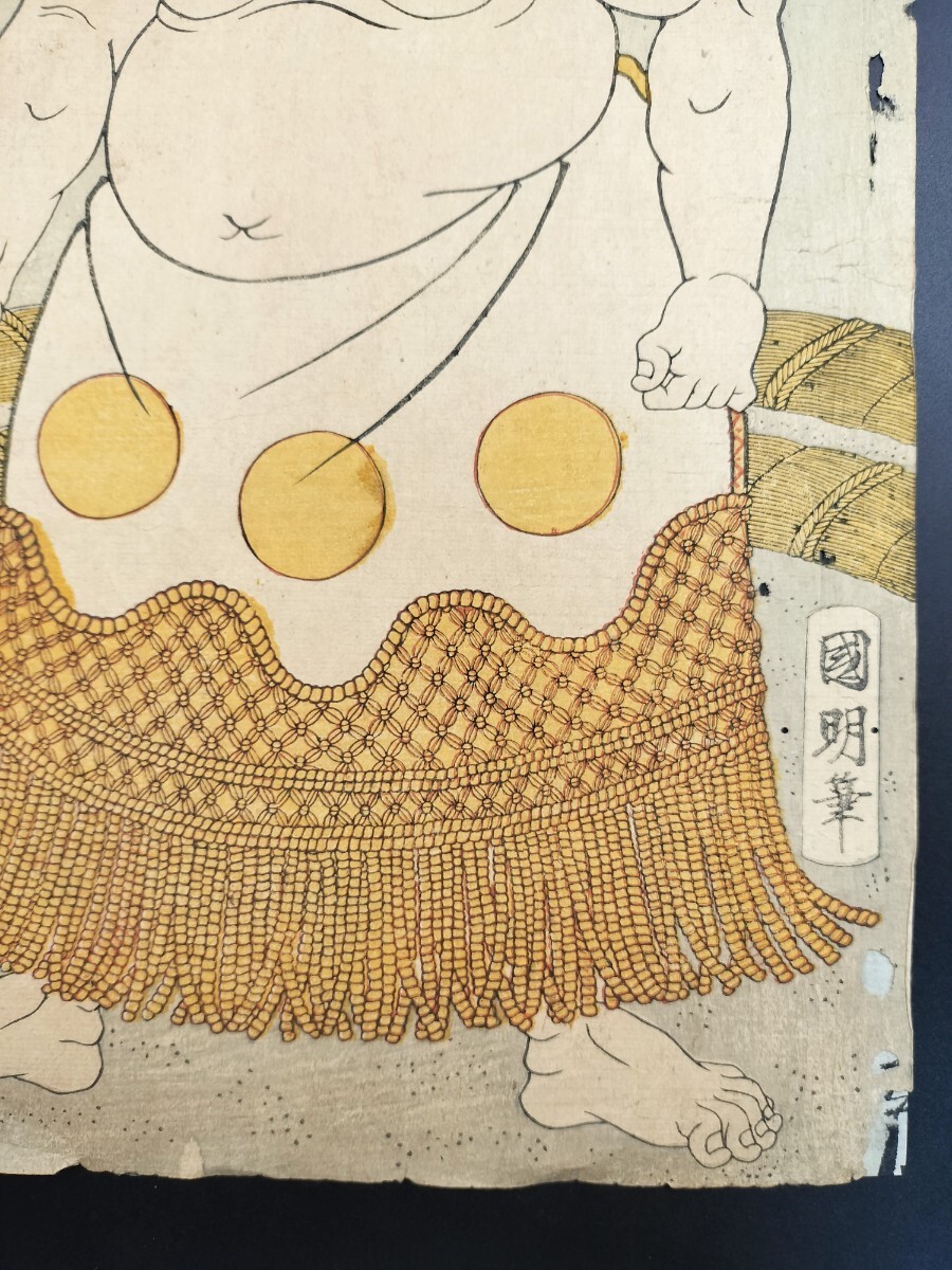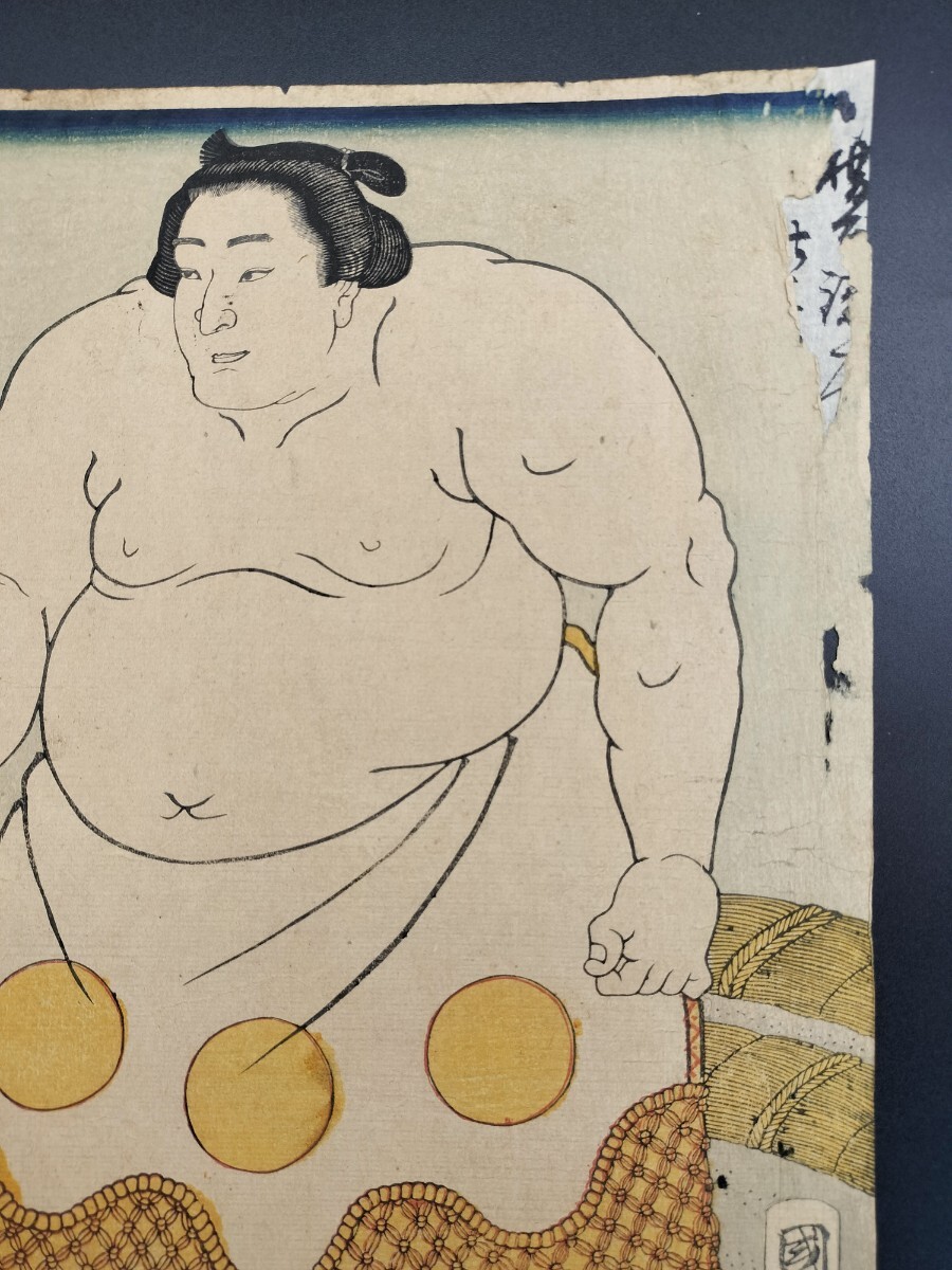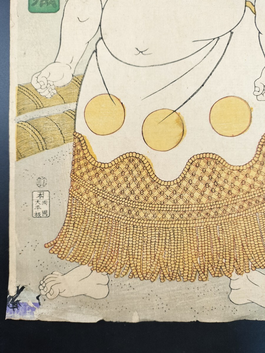 力士!明治期/真作 歌川国明「甲岩力藏」本物浮世絵木版画 相撲絵 武者絵 錦絵 大判 裏打ち
