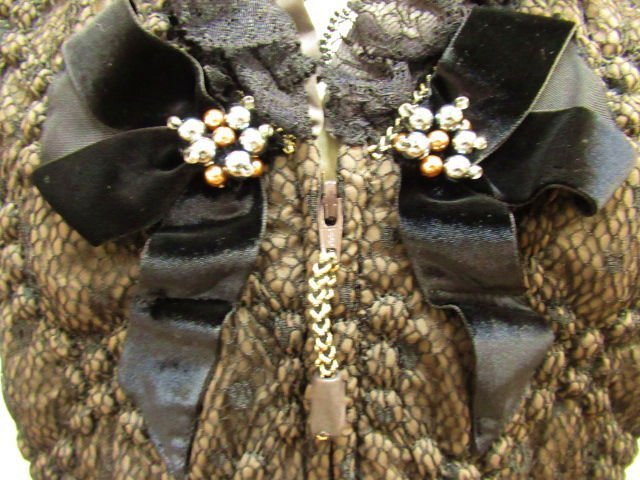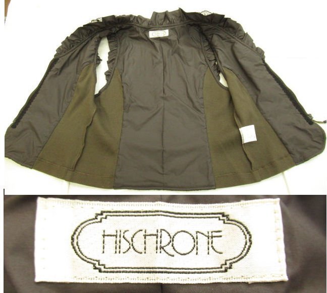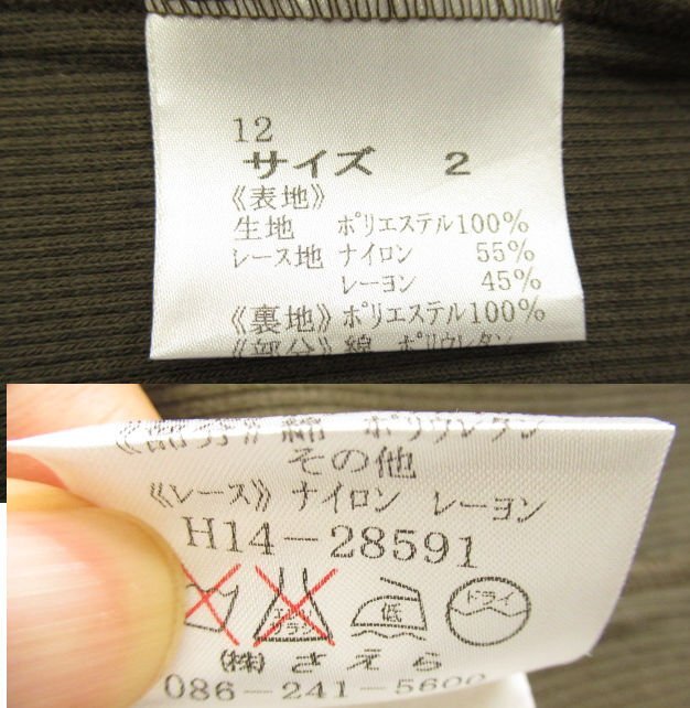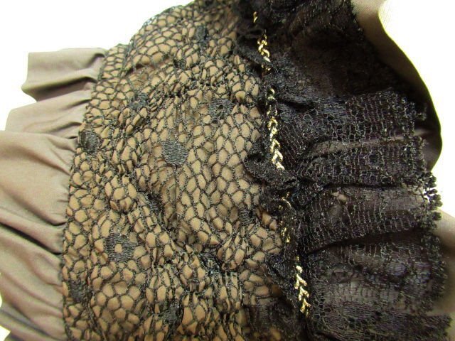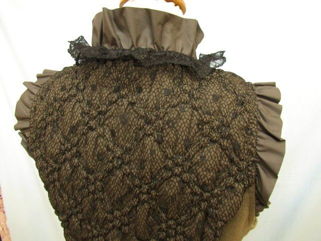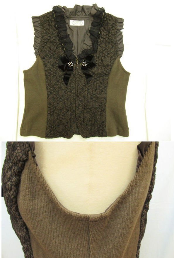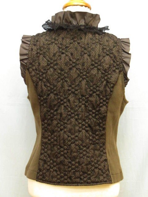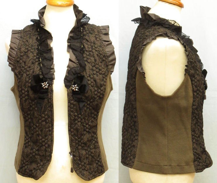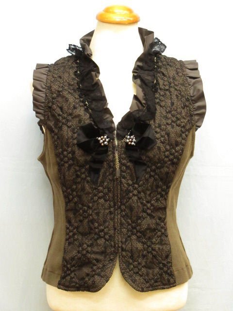 【色】 前後:茶色に黒のレース フリル:茶 サイド:カーキのような茶系 【サイズ】 表記:2 メジャー採寸: 約 肩幅29 肩上のフリル3 胸囲45 丈50 【素材】 生地:ポリエステル100 レース地:ナイロン55 レーヨン45 裏地:ポリエステル100 部分:綿 ポリウレタン レース:ナイロン レーヨン 【付属品】 なし 【参考定価】 -円 【商品説明】 さえらのヒスクローネブランドの画像のように前がファスナーになっているベストです。 両サイドが無地の生地で、前後が画像のようにポリエステル生地の表面に黒いレースの柄があります。 前の黒いリボンの中央にシルバーとゴールドのビーズが付いています。 -------------------------------------- 【状態ランク】 外観:A~B 中側:A~B 【状態説明】 ・特に目立つような汚れやシミ、レースの引っかきはありません。 ・サイドの脇の下の部分に若干毛羽立ちと目立たない程度の色あせがあります(画像8下)。 ・目立たない程度の小さな汚れ等はご了承下さい。 |