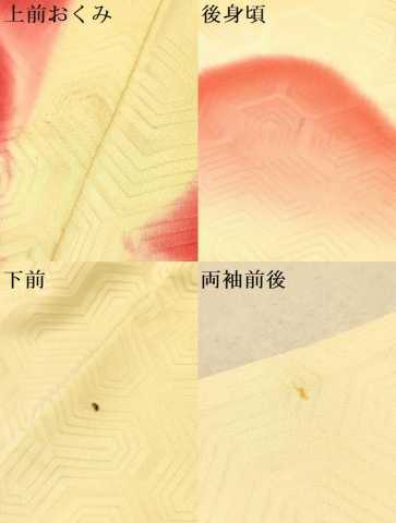 着物【正絹】の状態は接写画像のように 上前おくみ・後身頃・下前・両袖前後に薄い汚れがございますが その他特に目立ったシミ汚れなどもなく大変良い状態です。 大変上質な逸品になります。 お安く出品致しますので、是非この機会にいかがでしょうか? |