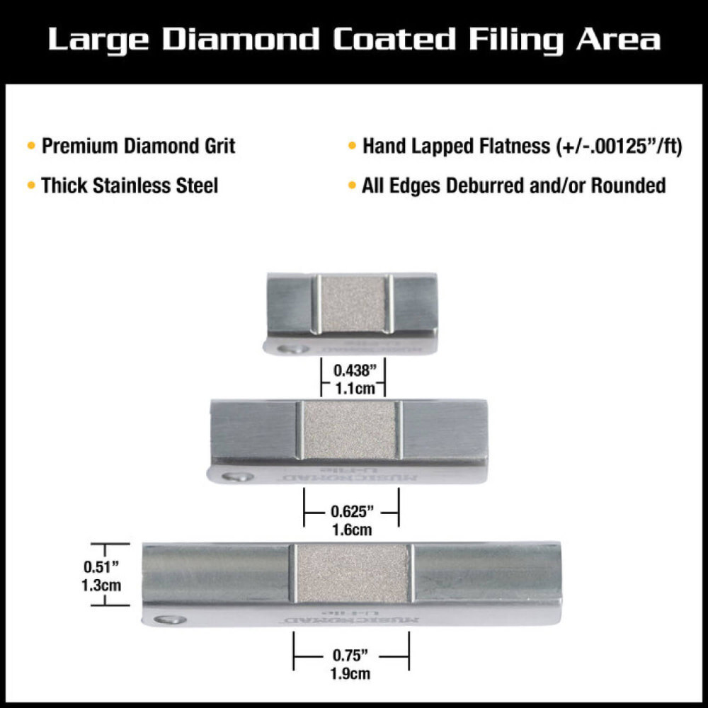 全てのフレットを削る必要はありません。わずか1~2本の高いフレットが原因のビビりやノイズには、MusicNomadのU-Fileセットが最適です。