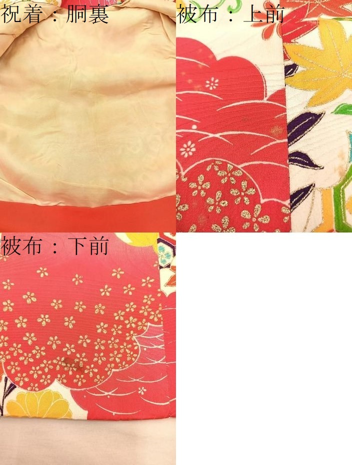 【祝着】 身丈 76.5cm(肩から) 裄丈 41cm(肩上げ 1cm) 袖丈 54.5cm 縫込み 3cm 袖幅 27cm 前幅 15cm 後幅 16cm 着物縫いこみ 内揚げ 0cm (腰上げ 7cm) 裄 お袖側 約2cm 身頃側 約1.5cm 【被布】 身丈 47.5cm(肩から) 裄丈 12cm(肩上げ 0cm) 《 サイズについてはこちら 》 |