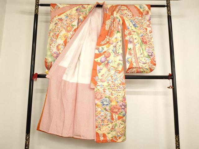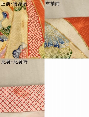 【祝着】 身丈 138cm(肩から) 裄丈 52.5cm(肩上げ 2.5cm) 袖丈 75cm 縫込み 9.5cm 袖幅 30.5cm 前幅 21.5cm 後幅 27cm 着物縫いこみ 内揚げ 2cm (腰上げ 0cm) 裄 お袖側 約5.5cm 身頃側 約6cm 《 サイズについてはこちら 》 |