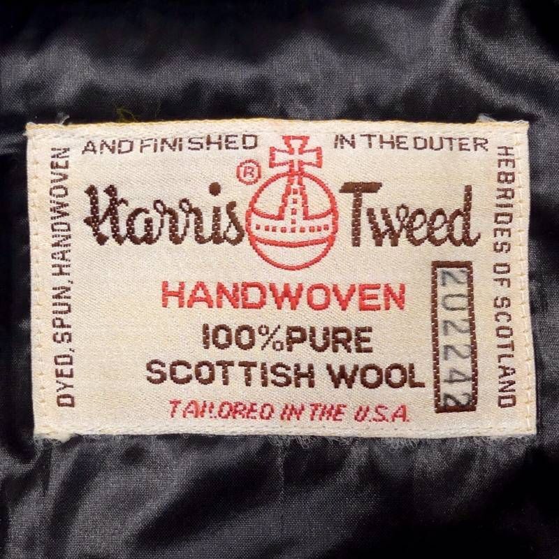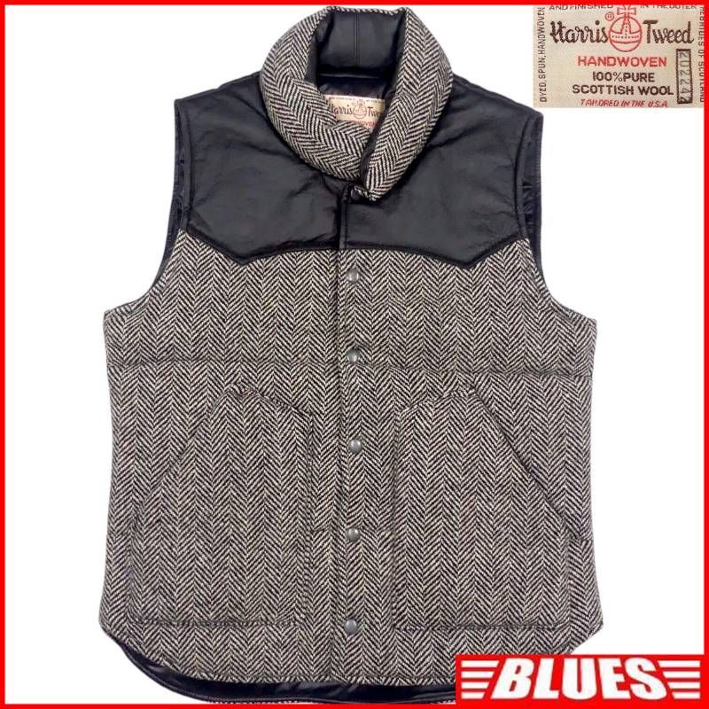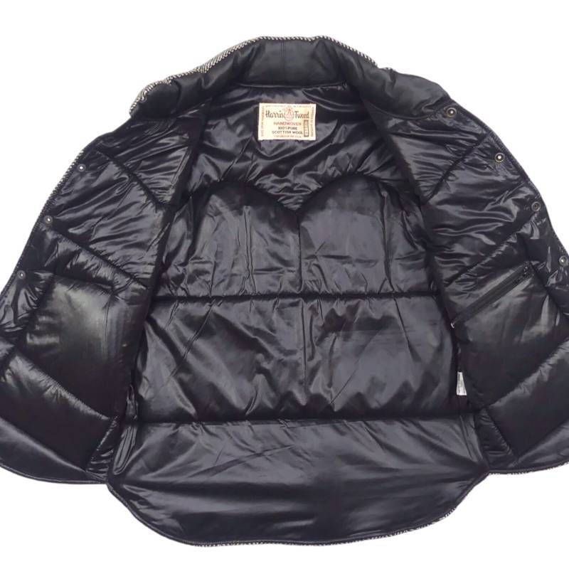 即決★Harris Tweed★メンズ M ダウンジャケット ハリスツイード 70s ヴィンテージ 黒 グレー ヘリンボーン柄 レザー切替 ウール USA製