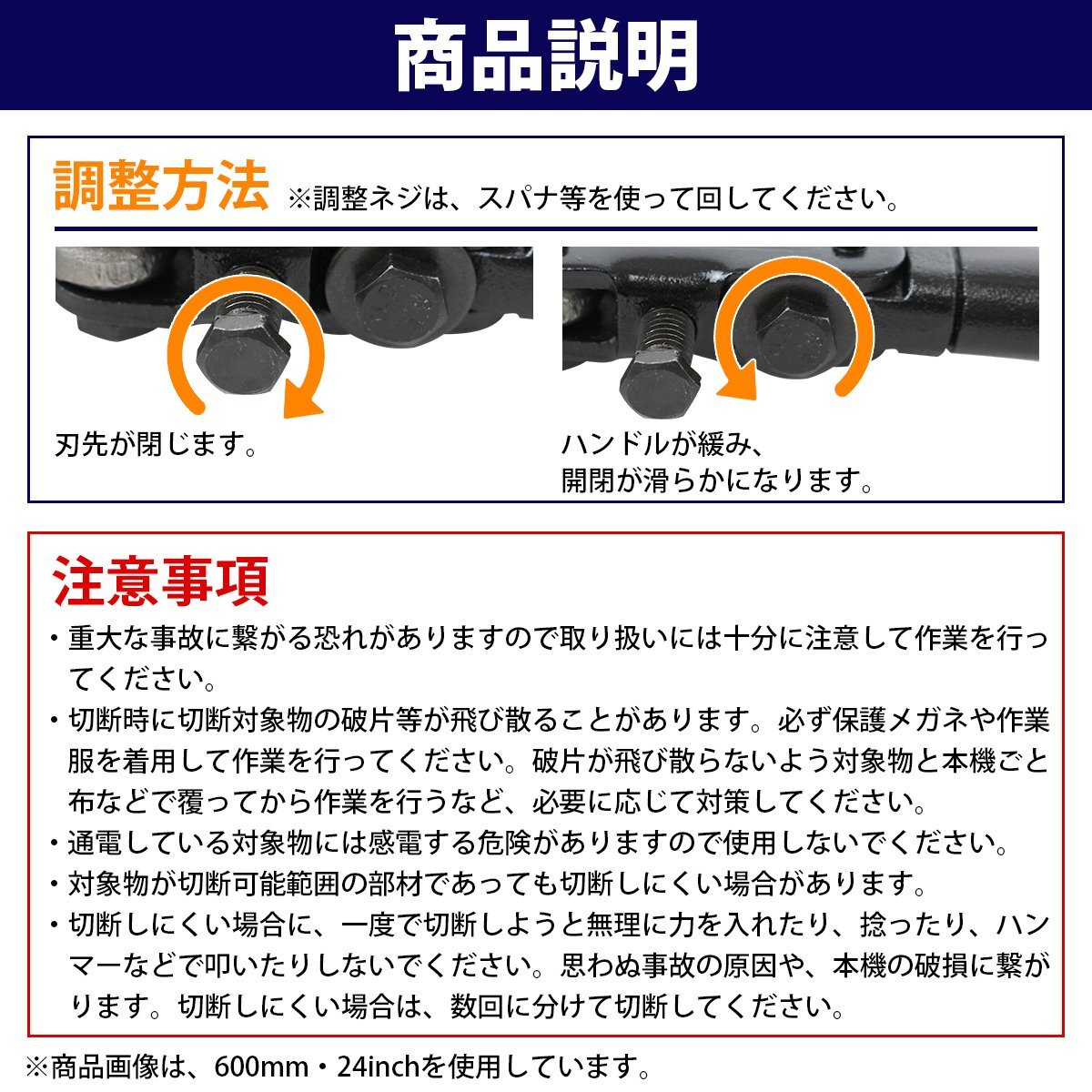 商 品 説 明★鉄筋やチェーン、カギをなくした南京錠、ボルトなど様々な線材も簡単に切断!