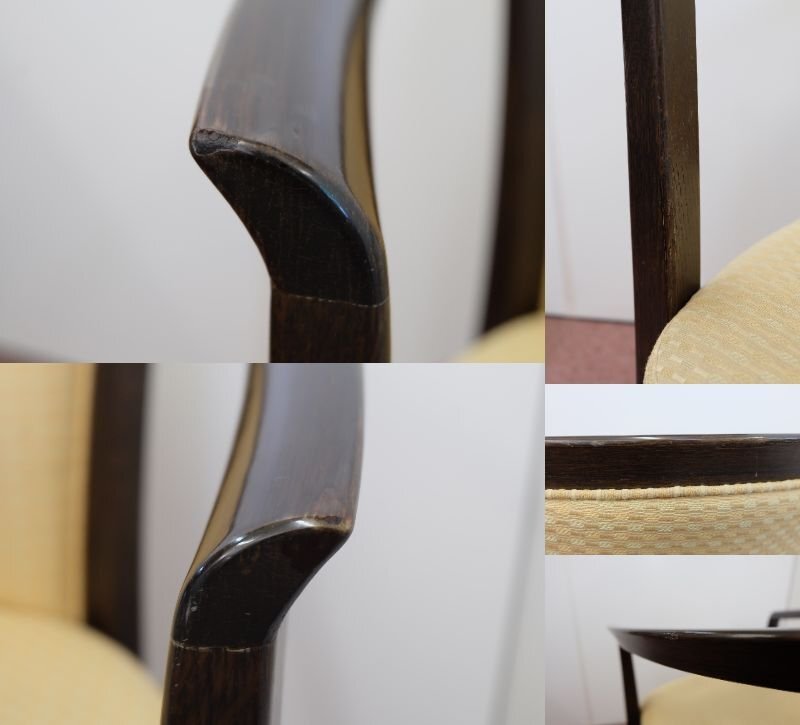 | ◇新品商品ではない為、細かい部分を気にされる方は入札をお控えください ◇ノークレーム・ノーキャンセル・ノーリターンでお願いいたします ■コンディション■ 〇画像5番目のように座面に黒ずんでいる汚れがあります 〇手すり、脚の部分にはすり傷があります(画像6.7番目) 〇座面・背面の布地部分は、毛玉・汚れがあり、使用感があります 〇クリーニングをしても取り切れない汚れ、傷がある場合があります ※他の3脚につきましても、同じような傷や汚れ等があります ■お取引の注意事項■