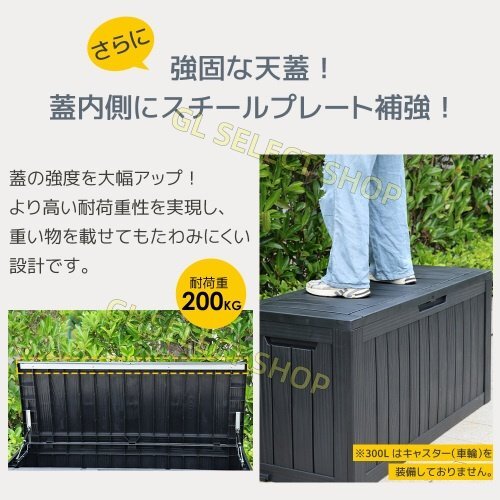• 【 サイズ別 こだわり機能 詳細】118L & 170L:シンプルで使いやすい基本設計。必要なものをすっきり収納。 270L: 【移動が超ラク!】底部に頑丈なキャスター(車輪)を標準装備!重い物を入れても、軽い力でスムーズに移動可能。ガレージや倉庫での出し入れが格段に楽になります! 300L:【重い蓋も軽々!】サポート付き開閉機構を採用!大きな蓋でも、片手でスムーズに開閉可能。開けた状態で固定されるので、中の物の出し入れも安心安全。【さらに強固な天蓋!】蓋内側にスチールプレート補強!蓋の強度を大幅アップ!より高い耐荷重性を実現し、重い物を載せてもたわみにくい設計です。